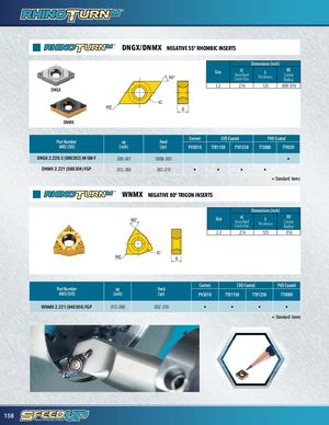 DNGX/DNMX NEGATIVE 55º RHOMBIC INSERTS Dimensions (inch) 55° Size ICInscribedCircle Dia.SThicknessRECornerRadius 2.2 .276 .125 .008-.016 DNGX IC RE S DNMX Part Number ap Feed Cermet CVD Coated PVD Coated ANSI (ISO) (inch) (ipr) PV3010 TT8115B TT8125B TT5080 TT9020 DNGX 2.220.5 (080302) M-SM-F .008-.047 .0008-.005 • DNMX 2.221 (080304) FGP .012-.080 .002-.010 • • • • •: Standard items WNMX NEGATIVE 80º TRIGON INSERTS Dimensions (inch) 80° Size ICInscribedCircle Dia.SThicknessRECornerRadius 2.2 .276 .125 .016 IC RE S Cermet CVD Coated PVD Coated Part Number ap Feed ANSI (ISO) (inch) (ipr) PV3010 TT8115B TT8125B TT5080 WNMX 2.221 (040304) FGP .012-.080 .002-.010 • • • • •: Standard items 158
