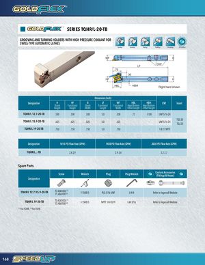 Helical Interp. Facing Lead Angle Plunge Slot Face Groove ID fnr Groove/Turn ID fnr Groove OD fnr Groove/ OD fnr Pro le OD Part-O Turn Taper HIDeliCTchoarnleItnaotduerrp. ODFaTRchaimrnegpad BLeaaladDnAcrienlldgle SpPColhtuaDnngrniellel HelicPaSlolIocntkteetrp. SERIES TQHR/L-20-TB FacFaeFcaGecrGionroogovvee/TurnIDLfIneDardGfnrAronRogevlleie/Tf urn IIDDPfflnnurrnGPgrreooolvee Groove/Turn OODDTfnufSrrnlnGor TtGraorpooevorev/eT/uOrOnDFDaGcfernoGrorPovoreov/eTlhereIaDdOfnDOr GPDaroGrtor-ovOoe/vTeurn ID fnr Groove OD fnr Groove/ OD fnr Pro leTurn TaperOD Part-O GROOVING AND TURNING HOLDERS WITH HIGH PRESSURE COOLANT FOR SWISS-TYPE AUTOMATIC LATHES OSDCRpCeoToanthomtDroleirnuailgrdl HFlBealatSiRclhBaanoolmcutInteplodtdemerrp. CSoprFDnoaDerctirrilDinllRMlgrnilildll HCLeoelCiauchdatSealAlrnIansnbitngeklrep. CFPoCPalnouhctcinanokmggueefrter FacLeeIRaGDdaSrmGolAoorpntovgoelv/eTeurn IGIDFDarPcoGfDelnoruGrorvnirloeRlog/veoeTelvui/erTfnurnIDIDIDfnGCfrrnhGoSraolrPnoovrntoeoev/lTelhe/TruearOndDIFDOfancDPfenrofrGGcnGrkrrooeroGotvroveoevo/evTueFIOrDanDcOOfenDDGTrGurTfGGourrnonrrorrnoovTiGnooveagrevvp/oT/eeeoTh//ruvTTruuren/rranndOGIDFDOraoGfcfDnorneorvrGofGeRvPnri/eorrnrToolgoRuioeverflvnelieef IODODDTfnuPfPrrananrPrtrirTnGto-agrOpoleoerve/ODODfnPfrrnoGrfirlPionrogvele/TuOrnDOGDThrorPeaoardvtien-O/gThread HOP DCoGolarontove WF B FClaoTCtu-oSBtoleoolrtitstnoingmk HCoolSCerhonConehutroalRdmunerdfrer CBoaDRularatinelmlcrMsepiidnllk ECnoDgSnrltaiolbvluer CCCRohhaoaamlnminpngfeelr SIDhPDooGurcirlkodleoetvr e .73 LF CNT FaIcDeDCGGhrrioalolonMovnvieleel/l/TTuurrnnIDGIGDrroPfoSnooolrvacveRkbe/ee/TtlTuiehrfrneadFaIcDOeDCfGnhfrranoPmrorGovfeeror/leTouvrenOODGIDfIrDnoGfrnoGrGrvorreRoo/eovTolveuive/reTfn/uTrunOrnIDIDFDaGGfcnrreoorfooPnvvrroeeR//TeTlehulierenfaOIdDDGOfrnoDroGGvreroo/oTovhveree/TaudOrnDOGDrfonorvGer/oTohvreeadODOGDroGorovoe/vTeurn Face fnr Relief .30 HF H HoElengCrhaavme fer BCaloaonlcinegd ESnhgorualvdeer CDoriolllMinigll ShSolualbder DChriallmMfilelr IDSGlarobove ID GCrhoaomvfee/rTurn ID GIDroGovroeo/Tvheread HIDOBDGrfLonorvGer/oTouvrne IDOGDrGoorovHoev/BTeh/HTruearnd FOaDcefnfnr rGRroeloievfe OD GrooRvei/gTuhrnt hFaacenfdnr Rsehlieof wn Dimension (inch) Designation H HF B LF WF HBL HBH CNT Insert Shank Functional Shank Functional Functional Head Bottom Head Bottom Height Height Width Length Width Offset Length Offset Height TQHR/L 12.7-20-TB .500 .500 .500 5.0 .500 .73 0.08 UNF 5/16-24 TQHR/L 15.9-20-TB .625 .625 .625 5.0 .625 - TQS 20-UNF 5/16-24TQJ 20 TQHR/L 19-20-TB .750 .750 .750 5.0 .750 - - 1/8 27 NPTF Designation 1015 PSI Flow Rate (GPM) 1450 PSI Flow Rate (GPM) 2030 PSI Flow Rate (GPM) TQHR/L...-TB 2.4-2.9 2.9-3.4 3.2-3.7 Spare Parts Screw Wrench Plug Plug Wrench Coolant Accessories(Fittings & Hoses) Designation TQHR/L 12.7/15.9-20-TB TS 40A100L (1)TS 40A100 (2) T-1508/5 PLG 5/16 UNF L-W 4 Refer to Ingersoll Website TQHR/L 19-20-TB TS 40A100L (1)TS 40A100 (2) T-1508/5 NPTF 1/8-TQ19 L-W 3/16 Refer to Ingersoll Website (1) For TQHR, (2) For TQHL 168