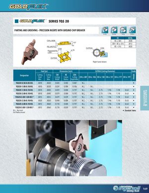 TT4430 pgarrotoinvging& Balanced Spot Drill Helical Interp. Facing Lead Angle Plunge Slot Face Groove ID fnr Groove/Turn ID fnr Groove OD fnr Groove/ OD fnr Pro le OD Part-O Turn Taper CBoalrannecreRdnd SCpooutteDrrsiilnl k HeliCcoanl Itnotuerrp. FaRcaimngp LeadDArinllgle SER PClhuanngneel IES TQS 20 PSoloctket FacFaecGe rGorooovvee/TurnID fInDr GfnrroRoevleie/Tf urn Groove/Turn IIDD ffnnrr GPrrooolvee OODDTfnufrrnnGr TGraorpooevorev/eT/uOrOnDDGfrnoroPvreo/TlhereadODOPDaGrtr-oOove PARTING AND GROOVING – PRECISION INSERTS WITH GROUND CHIP BREAKER COoBDranTlaehnrrecReanddd ICBDoaETulnahtgnerrceraseaviddnek OSDCpCoTonthotDroleirnuailgrdl HBelaSiRclhaanolmcuInepldtdeerrp. SpFDoaDrctirilDinllMlgrililll HLeelCiachdaSalAlnIannbtgelrep. FPCPalouhccinankmggeefter FacLeeIaGDdSrGolAoorntovgoelv/eTeurn IGIDFDarPcoGfelnoruGorvnroeRog/veoeTelvui/erTfnurnIDIDIDfnGfrrnGoSrolrPoovrtoeov/Telhe/TruearOndDIFDOfancDfenr frGGnGrrrooroGovroveoevo/evTueIOrDnDOOfnDDGTrurTfGGournnrrorrnoovTiGnooeagrvvp/oTeeeoh//rvTTruue/rranndOIDFDOaGfcfDnrneorrGofGvPnriorrnroogoRovelvelieef OODDTuPfPrananrrtriTnGt-agrOpoeorve/ ODPfrnorfilPinrgo le OD Part-O RE RETOL CW ±.0008 RE ≤ .004 .0008 .157 .004 < RE ≤ .016 .0012 FlBaat lBaontcteodm CoERrnnegaermraRvned FClaoCtuoBtoeolrtistnoingmk CoSCrhononeutrolRdunerdr CoDRuratielmlrMspiinllk RE ±RETOLCoDSnlrtaiolblur CCRhhaaamCnmpnDfeelXrRepeatability 4° RE > .016 .0020IDPDoGrcirlkoleotve ø.F7aI9cDeCGGhrroaoonovnveee/l/TTuurrnnIDGIGDrroPfonooorvcvCeRke/ee/UTtlTuiehTrfrneDadIFAaIcDOeDfGnfrrnoProrGovero/leTouvrenOCODGIDDfrnoXGfrnorGrvoreRoo/evToleuive/reTfn/uTrunOrnDIFDaGfcnreorfoPnvrroeR/TelehlierefaOdD OfnDr GGrroooovvee/TuOrnD Groove/ThreadOD Groove ±.001 CUTDIA ole Chamfer BaT-laSnlocted HoElengCrhaavme fer BCaloaonlcinegd ESnhgorualvdeer CDoriolllMinigll ShSolualbder DChriallmMfilelr IDSGlarobove ID GCrhoaomvfee/rTurn ID GRIDroiGogvrhoeo/tTvhheraeanddIDOsDGhrfoonowrvGenr/oTouvrne IDOGDrGoorovoev/Teh/Truearnd FOaDcefnfnr rGRroeloievfe OD Groove/Turn Face fnr Relief Feed (ipr) Dimension (inch) CUTDIA (Cutting Diameter) Grade Designation Cutting Cutting CW RE CDX Feed Feed Cutting Corner Cutting CDX ≤ .087 CDX ≤ .106 CDX ≤ .138 CDX ≤ .157 CDX ≤ .177 CDX ≤ .197 Min. Max. Width Radius Depth Max. TQS20-0.50-0.05-R/L .0010 .0030 0.020 0.002 0.087 N.L. - - - - - • TQS20-1.00-0.10-R/L .0010 .0030 0.039 0.004 0.106 N.L. N.L. - - - - • TQS20-1.50-0.10-R/L .0010 .0040 0.059 0.004 0.197 N.L. N.L. 2.75 1.96 1.18 0.63 • TQS20-2.00-0.10-R/L .0010 .0040 0.079 0.004 0.197 N.L. N.L. 2.75 1.96 1.18 0.63 • TQS20-2.00-1.00-R/L* .0015 .0055 0.079 0.039 0.197 N.L. N.L. 2.75 1.96 1.18 0.63 • TQS20-2.50-0.10-R/L .0020 .0050 0.098 0.004 0.197 N.L. N.L. 2.75 1.96 1.18 0.63 • TQS20-3.00-0.10-R/L .0015 .0060 0.118 0.004 0.197 N.L. N.L. 2.75 1.96 1.18 0.63 • TQS20-3.00-1.50-R/L* .0015 .0060 0.118 0.059 0.197 N.L. N.L. 2.75 1.96 1.18 0.63 • N.L. : No Limit •: Standard items Full Radius Insert 169