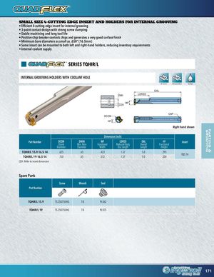 pgarrotoinvging& SMALL SIZE 4-CUTTING EDGE INSERT AND HOLDERS FOR INTERNAL GROOVING • Efficient 4-cutting edge insert for internal grooving • 3-point contact design with strong screw clamping • Stable machining and long tool life • Positive chip breaker controls chips and generates a very good surface finish • Minimum bore diameters as small as .650” (16.5mm) • Same insert caIInDDTThhbrreeeaaddmounOODDteTThhdrreeaadtdo botBBhaallaalnnecceefddt and right-hand holders, SSppoottDDrriillll HHeelliiccaallIInntteerrpp.. reFFaadcciinnuggcing iLnLeeaavddeAAnnnggllteeory requirements IDPPTlluhunrneggaeed OD TSShlloorettad FFBaaacceelaGGnrrocoeoovdvee IIDD ffnnSrrpGGorrtooDoorvvielel//TTuurrnn HIIDeDliffcnnarrlGGInrrooteoorvvpee. OODD FffnnarcriGGnrrgoooovvee// OOLDDTTuurrnnTTaappeerr • Internal coolant supply RReeaamm FFllaatt BBoottttoomm SERI CCoorrnneerrRRnndd ES TQHIR/L CCoouutteerrssiinnkk CCoonnttoouurr RRaammpp DDrriillll CCRhheaaannmnneell FlatPPBoocockktteeottm FFaaccCeeoGGrnrrooeoorvvReen//TdTuurrnn IICDDoffunntrreRrRseeilnliiekeff IIDDCffnonrnr PtPorrouofirfillee OODD ffnnrrRGGarrmoooopvvee//TTuurrnnOODD GGGGrroooovvee//TTuurrnn INTERNAL GROOVING HOLDERS WITH COOLANT HOLE TT--SSlloott HHoollee CChhaammffeerr BBaallaanncceedd EEnnggrraavvee CCoooolliinngg SShhoouullddeerr DDrriillllMMiillll T-SSSlllaaobbt HolCCehhCaahmmafmfeerfrer BIIIDDDalGGGanrrrooocooeovvdveee IIDIDDGGGErnrrooogooorvvvaeeev//T/eTuTuurnrrnn IIDD GGrrCooCooovovoelleai//nnTTghthrreeaadd OODDShffnnorur GlGdrreooroovvee OODD OAL DMIN LDRED CDX WF CSP DCON HF Right hand shown Dimension (inch) Part Number DCON DMIN WF LDRED OAL HF Insert Shank Min. Bore Functional Reduced Body Overall Functional Diameter Diameter Width Dia. Length Length Height TQHIR/L 15.9-16.5-14 .625 .65 .433 1.57 5.0 .295 TQIS 14 TQHIR/L 19-16.5-14 .750 .65 .512 1.57 5.0 .354 CDX: Refer to insert dimension Spare Parts Screw Wrench Seal Part Number TQHIR/L 15.9 TS 25075I/HG T8 PL 062 TQHIR/L 19 TS 25075I/HG T8 PL 075 171