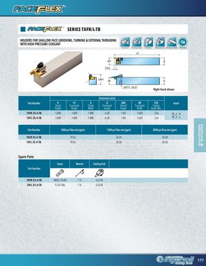 pgarrotoinvging& OD Thread Balanced Spot Drill Helical Interp. Facing Lead Angle Plunge Slot Face Groove ID fnr Groove/Turn ID fnr Groove OD fnr Groove/ OD fnr Profile OD Part-Off Turn Taper IFDlaTSthpBreooattdtDormill OCHDoerTlnhiIcerDaerlaTRIdhnnrdteeardp. BCaolaunOtFecaDercsdiTinnhgkread SpCoLoet anDBdtraoilAlualnnrgceled HelicaRl PaISnmlputoepntrgpDe.rill SERIES TXFR/L-TB FaHcDeinlriSigcllaloltInterp.LeaCdFahAcaennFGgnarloeciolnvgeIDPfnluPrLnoGecgarkeodeotAvneg/TluernFaceIDGSrlfoonotrPvlGeur/noTugorevne FGIaDOcreoDfTGonurvfronreRonr/veTGSTeulalirroeponfteorveI/D fnIrDOGfDrnoFrfoanPcvrereoPG/fiTrouleofirnvlee OIDDfIfnDnOrrfDGnGrrPooaGoorrvtvo-eOeo/vTffuer/TnuOrODnDTGufrnronIroDGTvafrenpo/reoThrGvrereo/aodve ODOfnDOrGDPTrurfonrofinrvlGTearpoeorve/OD POarDt-fOnfrf Profile OD Part-Off HOLDERS FOR SHALLOW FACE GROOVING, TURNING & EXTERNAL THREADING WITH HIGH-PRESSURE COOLANT HoRlCeoaCumhtIeaDrmsTihfnerkread FlaBt BaCloaotntOnRoctDemoadTumhrread CorEnneFgrlRarRaBtnmvBadelopatntocemd CouCtoeCroosDlrSinrpiekglolrtRDnrdill CSohnCoHtohoueuaulldrintcenarelslIintkerp. RDarmiPlClpoMocnFiklateloctiunrg FaceDrGSilrLlaoReboavdmeA/pTnugrnle CGIhCDrahonfaonnmvreeDRPfl/erelTiurulilnrengf e IPDocfGnkrCerohtPoarvnoSefinloeltel FacOIeDDGGrfonroorovGFvePare/ocT/eoTcuukGvrenrronot/oTouvveernIDGIODrGDoFfronaGoFIvDcraoreecRovef/oGneTGuvl/riTroereGohno/forTrvvoeheeoar//edvTTuaeurd/rnTnuIDrOnfDnOrOfGInDPDrIrDoGoGfGonfirrfrvoronoleoeoRrov/veGTveeuleriorenOof vDeOfOnDDrGGGIrrrDoooOooofDvvnTveueref/n/rT/PTnTurururoGTnrrafinnrpolOeeoODrvDeGFG/raOroocDoeovvfeneO//rDTTGhRhfrreneoelarioaedPdvfreo/fiTuHlerPnOCODoDoGlaGrnoOrtoDvoevPea/rTth-Oreffad OD Groove LF WF B T-SElnogt rRaveeam Hole CChoFalomTa-ltSifnelBogrotttom BalHaSnohcCloeoudCrlndheearrmRfnedr EngDrBarCivaloelMauntiecllersdink CooliEnSnglCagobrnatvoeur ShouClhCdaoemorRlfaienmrgp DriIlDlMSGhilrolouDolrvdielelr IDSGlaroDborCivlhelMa/Tnuilnrlenl IDCCGhrDaomoXfveeSrP/lTaohbcrkeeatd IDOGFDarcofneCorhvGGaermoroofovevere/TuIDrnGOrDooGvIrGeDor/ooTGfvuonrervon/eoRT/uveTreulniIreDnf GroFoaIDvceIG/DfTrnhofrnroRervaePdl/riToeuffirlneODIDfOnGrDGrfonrorvoGevr/eTohorveeaO/dTDurGnrOoODoDvGefr/noTruoGrvnreo/TohvreeFadceOfnDrGROreDoloiGevfreo/oTuvren Face fnr Relief OAH HF H T-Slot Hole Chamfer Balanced Engrave Cooling Shoulder DrillMill Slab Chamfer ID GNroPovTeF 1/8ID-2Gr7oove/Turn ID Groove/Thread OD fnr Groove OD Groove/TurnRight hand shownFace fnr Relief Dimension (inch) Part Number H HF B LF OAH WF CDX Insert Shank Functional Shank Functional Overall Functional Cutting Height Height Width Length Height Width Depth Max. TXFR 25.4-TB 1.000 1.000 1.000 6.28 1.04 1.020 .236 TD_X ...R TXFL 25.4-TB 1.000 1.000 1.000 6.28 1.04 1.020 .236 TD_X ...L Part Number 1000 psi flow rate (gpm) 1500 psi flow rate (gpm) 2000 psi flow rate (gpm) TXFR 25.4-TB 19-26 26-34 30-38 TXFL 25.4-TB 19-26 26-34 30-38 Spare Parts Screw Wrench Cooling Unit Part Number TXFR 25.4-TB SM35-110-00 T 15 S-CU-TB TXFL 25.4-TB TS 35110IL T 15 S-CU-TB 177