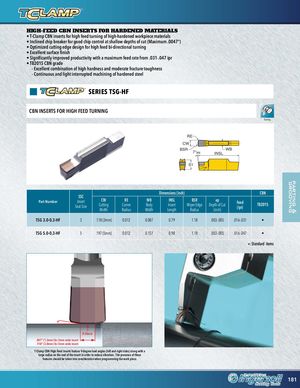 pgarrotoinvging& HIGH-FEED CBN INSERTS FOR HARDENED MATERIALS • T-Clamp CBN inserts for high feed turning of high-hardened workpiece materials • Inclined chip breaker for good chip control at shallow depths of cut (Maximum .0047") • Optimized cutting edge design for high feed bi-directional turning • Excellent surface finish • Significantly improved productivity with a maximum feed rate from .031-.047 ipr ID • Thread TB20OD1T5hreCadBN grBaadlaneced Spot Drill Helical Interp. Facing Lead Angle Plunge Slot Face Groove ID fnr Groove/Turn ID fnr Groove OD fnr Groove/ OD fnr Profile OD Part-Off - Excellent combination of high hardness and moderate fracture toughness Turn Taper - Continuous and light interrupted machining of hardened steel Ream Flat Bottom Corner Rnd Coutersink SERIE Contour S TSRGamp-HF Drill Channel Pocket Face Groove/Turn ID fnr Relief ID fnr Profile OD fnr Groove/TurnOD Groove/Thread OD GrooveGroove/Turn CBN INSERTS FOR HIGH FEED TURNING T-Slot Hole Chamfer Balanced Engrave Cooling Shoulder DrillMill Slab Chamfer ID Groove ID Groove/Turn ID Groove/Thread OD fnr Groove OD GTruoronivneg/Turn Face fnr Relief RE CW BSR 7°AN WBINSL S1 Dimensions (inch) CBN SSC Part Number Insert CWSeat SizeCuttingWidth RECornerRadius WBBodyWidth INSLInsertLength BSR apWiper EdgeDepth of CutRadius(inch)Feed(ipr) TB2015 TSG 3.0-0.3-HF 3 .118 (3mm) 0.012 0.087 0.79 1.18 .003-.005 .016-.031 • TSG 5.0-0.3-HF 5 .197 (5mm) 0.012 0.157 0.98 1.18 .003-.005 .016-.047 • •: Standard items 9º R 30mm .047" (1.2mm) for 3mm wide insert .118" (3.0mm) for 5mm wide insert T-Clamp CBN High Feed inserts feature 9-degree lead angles (left and right sides) along with a large radius on the end of the insert in order to reduce vibration. The presence of these features should be taken into consideration when programming the work piece. 181