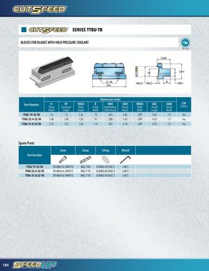 SERIES TTBU-TB BLOCKS FOR BLADES WITH HIGH-PRESSURE COOLANT HP Coolant OAW HF H OAH G 1/8OAL HBLD WBLD B HBH Dimension (inch) Part Number H HF HBLD B HBH OAH WBLD OAL OAW CSPShankFunctionalBladeShankHead BottomOverallBladeOverallOverallCoolant Height Height Height Width Offset Height Height Width Length Width TTBU 19-32-TB .75 .75 1.26 .75 .625 2.02 .209 3.44 1.5 Yes TTBU 25.4-32-TB 1.00 1.00 1.26 .91 .300 1.95 .209 4.33 1.7 Yes TTBU 31.8-32-TB 1.25 1.25 1.26 1.14 .207 2.10 .209 4.33 1.9 Yes Spare Parts Screw Clamp O-Ring Wrench Part Number TTBU 19-32-TB SR M6X16 DIN912 BKU 100 O-RING ID14X2.5 L-W 5 TTBU 25.4-32-TB SR M6X16 DIN912 BKU 110 O-RING ID14X2.5 L-W 5 TTBU 31.8-32-TB SR M6X16 DIN912 BKU 110 O-RING ID14X2.5 L-W 5 184