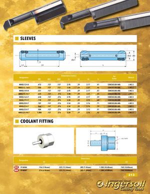 SLEEVES Ød2 ØD Ød1 h L3 L4 L Dimensions (inches)DesignationØDØd1Ød2LL3L4 h SetScrew Wrench MINSL12-4-4 .472 .157 .157 2.95 .39 2.17 .41 SSM5X0.8X4-MG L-W2.5 MINSL12.7-4-4 .500 .157 .157 3.00 .39 2.21 .46 SSM5X0.8X4-MG L-W2.5 MINSL14-4-4 .551 .157 .157 2.95 .39 2.17 .47 SSM5X0.8X6-MG L-W2.5 MINSL15.9-4-7 .625 .157 .276 3.00 .39 2.21 .55 SSM5X0.8X6-MG L-W2.5 MINSL16-4-7 .630 .157 .276 2.95 .39 2.17 .59 SSM5X0.8X6-MG L-W2.5 MINSL19-4-7 .750 .157 .276 3.50 .39 2.72 .68 SSM5X0.8X6-MG L-W2.5 MINSL20-4-7 .787 .157 .276 3.54 .39 2.76 .71 SSM5X0.8X6-MG L-W2.5 MINSL22-4-7 .866 .157 .276 3.54 .39 2.76 .79 SSM5X0.8X6-MG L-W2.5 MINSL25-4-7 .984 .157 .276 3.94 .39 3.15 .91 SSM5X0.8X6-MG L-W2.5 MINSL25.4-4-7 1.000 .157 .276 3.54 .39 2.76 .92 SSM5X0.8X6-MG L-W2.5 COOLANT FITTING L3 L1 L2 1/8-27 NPTF D1 D2 Dimensions Designation D1 L1 L2 L3 D2 PF-MIN4 .156 (3.96mm) .525 (13.34mm) .285 (7.24mm) 1.200 (30.48mm) .740 (18.80mm) PF-MIN7 .274 (6.96mm) .525 (13.34mm) .285 (7.24mm) 1.200 (30.48mm) .740 (18.80mm) 213