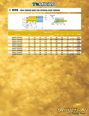 Tmax MINB - MINI CARBIDE BARS FOR INTERNAL BACK TURNING Min. Bore Dia. f dh6 a 30 °R Tmax l3 1. 5 3° l3 l1 Dimensions (inches) Designation dh6 f a L1 L3 R±0.002 Tmax Dmin R/L Grade MINBR04-140010D030 .157 .024 .102 1.181 .591 .008 .020 .118 R TT9030 MINBR04-190010D030 .157 .024 .102 1.378 .787 .008 .020 .118 R TT9030 MINBR04-140015D040 .157 .059 .138 1.181 .591 .006 .031 .157 R TT9030 MINBR04-240015D040 .157 .059 .138 1.575 .984 .006 .031 .157 R TT9030 MINBR07-190020D050 .276 .035 .173 1.378 .787 .008 .039 .197 R TT9030 MINBR07-290020D050 .276 .035 .173 1.772 1.181 .008 .039 .197 R TT9030 MINBR07-190020D060 .276 .071 .209 1.378 .787 .008 .071 .236 R TT9030 MINBR07-290020D060 .276 .071 .209 1.772 1.181 .008 .071 .236 R TT9030 MINBR07-190020D070 .276 .110 .248 1.378 .787 .008 .098 .276 R TT9030 MINBR07-290020D070 .276 .110 .248 1.772 1.181 .008 .098 .276 R TT9030 221