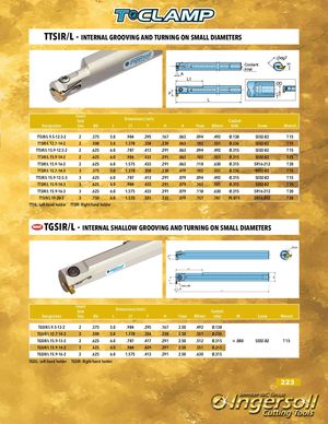 TTSIR/L - INTERNAL GROOVING AND TURNING ON SMALL DIAMETERS Ødg7 Coolant H Inlet A L1 ØD F L T InsertSeat Dimensions (inch) Coolant Designation Size Ød L L1 F H A Tmax ØDmin Inlet Screw Wrench TTSIR/L 9.5-12.5-2 2 .375 5.0 .984 .295 .167 .063 .094 .492 Ø.138 SE02-82 T 15 TTSIR/L 12.7-14-2 2 .500 5.0 1.378 .358 .230 .063 .102 .551 Ø.236 SE02-82 T 15 TTSIR/L 15.9-12.5-2 2 .625 6.0 .787 .413 .291 .063 .094 .492 Ø.315 SE02-82 T 15 TTSIR/L 15.9-14-2 2 .625 6.0 .984 .433 .291 .063 .102 .551 Ø.315 SE02-82 T 15 TTSIR/L 15.9-16-2 2 .625 6.0 1.575 .433 .291 .063 .118 .630 Ø.315 SR16-212 T 20 TTSIR/L 12.7-14-3 3 .375 5.0 1.378 .358 .230 .079 .102 .551 Ø.236 SE02-82 T 15 TTSIR/L 15.9-12.5-3 3 .625 6.0 .787 .413 .291 .079 .094 .492 Ø.315 SE02-82 T 15 TTSIR/L 15.9-14-3 3 .625 6.0 .984 .433 .291 .079 .102 .551 Ø.315 SE02-82 T 15 TTSIR/L 15.9-16-3 3 .625 6.0 1.575 .433 .291 .079 .118 .630 Ø.315 SR16-212 T 20 TTSIR/L 19-20-3 3 .750 6.0 1.575 .551 .335 .079 .157 .787 PL 075 SR16-212 T 20 TTSIL: Left-hand holder TTSIR: Right-hand holder TGSIR/L - INTERNAL SHALLOW GROOVING AND TURNING ON SMALL DIAMETERS InsertSeat Dimensions (inch) Coolant Designation Size Ød L L1 F H Tmax ØDmin Inlet W Screw Wrench TGSIR/L 9.5-13-2 2 .375 5.0 .984 .295 .167 2.50 .492 Ø.138 TGSIR/L 12.7-14-2 2 .500 5.0 1.378 .354 .230 2.50 .551 Ø.236 TGSIR/L 15.9-13-2 2 .625 6.0 .787 .417 .291 2.50 .512 Ø.315 < .080 SE02-82 T 15 TGSIR/L 15.9-14-2 2 .625 6.0 .984 .429 .291 2.50 .551 Ø.315 TGSIR/L 15.9-16-2 2 .625 6.0 1.575 .413 .291 2.50 .630 Ø.315 TGSIL: Left-hand holder TGSIR: Right-hand holder 223