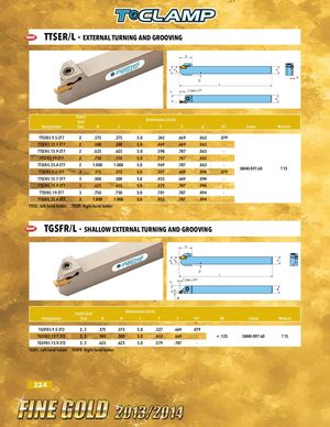 H2H2 TTSER/L - EXTERNAL TURNING AND GROOVING .275” InsertSeat Dimensions (inch) Designation Size H B L F E A H1 Screw Wrench TTSER/L 9.5-2T7 2 .375 .375 5.0 .343 .669 .063 .079 TTSER/L 12.7-2T7 2 .500 .500 5.0 .469 .669 .063 - TTSER/L 15.9-2T7 2 .625 .625 5.0 .598 .787 .063 - TTSER/L 19-2T7 2 .750 .750 5.0 .717 .787 .063 - TTSER/L 25.4-2T7 2 1.000 1.000 5.0 .969 .787 .063 - SM40-097-60 T 15 TTSER/L 9.5-3T7 3 .375 .375 5.0 .327 .669 .094 .079 TTSER/L 12.7-3T7 3 .500 .500 5.0 .453 .669 .094 - TTSER/L 15.9-3T7 3 .625 .625 5.0 .579 .787 .094 - TTSER/L 19-3T7 3 .750 .750 5.0 .701 .787 .094 - TTSER/L 25.4-3T7 3 1.000 1.000 5.0 .953 .787 .094 - TTSEL: Left-hand holder TTSER: Right-hand holder TGSFR/L - SHALLOW EXTERNAL TURNING AND GROOVING .079” Insert Seat Dimensions (inch) Designation Size H B L F E H1 W Screw Wrench TGSFR/L 9.5-3T2 2, 3 .375 .375 5.0 .327 .669 .079 TGSFR/L 12.7-3T2 2, 3 .500 .500 5.0 .453 .669 - < .125 SM40-097-60 T 15 TGSFR/L 15.9-3T2 2, 3 .625 .625 5.0 .579 .787 - TGSFL: Left-hand holder TGSFR: Right-hand holder 224
