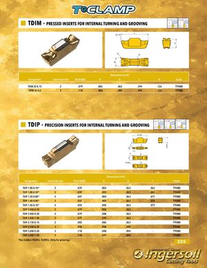 TDIM - PRESSED INSERTS FOR INTERNAL TURNING AND GROOVING Dimensions (inch) Designation Insert Seat Size W±0.002 R B L H Grade TDIM 2E-0.15 2 .079 .006 .063 .394 .126 TT9080 TDIM 3E-0.2 3 .118 .008 .094 .394 .126 TT9080 TDIP - PRECISION INSERTS FOR INTERNAL TURNING AND GROOVING .394 Dimensions (inch) Designation Insert Seat Size W±0.0008 R B T Grade TDIP 1.00-0.10* 2 .039 .004 .063 .063 TT9080 TDIP 1.00-0.50* 2 .039 .020 .063 .063 TT9080 TDIP 1.20-0.00* 2 .047 .000 .063 .071 TT9080 TDIP 1.40-0.00* 2 .055 .000 .063 .079 TT9080 TDIP 1.50-0.10* 2 .059 .004 .063 .079 TT9080 TDIP 2.00E-0.10 2 .079 .004 .063 - TT9080 TDIP 2.00E-0.20 2 .079 .008 .063 - TT9080 TDIP 2.00E-1.00 2 .079 .039 .063 - TT9080 TDIP 2.15E-0.15 2 .085 .006 .063 - TT9080 TDIP 2.50E-0.20 3 .098 .008 .094 - TT9080 TDIP 3.00E-0.20 3 .118 .008 .094 - TT9080 TDIP 3.00E-1.50 3 .118 .059 .094 - TT9080 *Use holders TGSIR/L, TGSFR/L. (Only for grooving) 225 .126