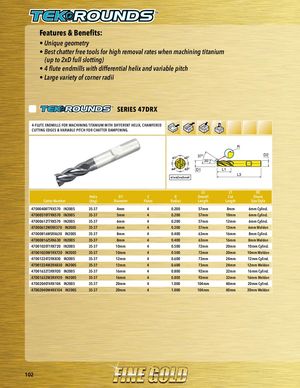Features & Benefits: • Unique geometry • Best chatter free tools for high removal rates when machining titanium (up to 2xD full slotting) • 4 flute endmills with differential helix and variable pitch • Large variety of corner radii SERIES 47DRX 4-FLUTE ENDMILLS FOR MACHINING TITANIUM WITH DIFFERENT HELIX, CHAMFERED CUTTING EDGES & VARIABLE PITCH FOR CHATTER DAMPENING. R 37° D2 35° D1 L1 L3 L3 L1 D2 Helix D1 Z R Overall Cut Shank Cutter Number (deg) Diameter Flutes Radius Length Length Size/Style 47D00408T7RX570 IN2005 35-37 4mm 4 0.200 57mm 8mm 6mm Cylind. 47D00510T7RX570 IN2005 35-37 5mm 4 0.200 57mm 10mm 6mm Cylind. 47D00612T7RX570 IN2005 35-37 6mm 4 0.200 57mm 12mm 6mm Cylind. 47D00612WERX570 IN2005 35-37 6mm 4 0.200 57mm 12mm 6mm Weldon 47D00816WSRX630 IN2005 35-37 8mm 4 0.400 63mm 16mm 8mm Cylind. 47D00816ZSRX630 IN2005 35-37 8mm 4 0.400 63mm 16mm 8mm Weldon 47D01020T1RX720 IN2005 35-37 10mm 4 0.500 72mm 20mm 10mm Cylind. 47D01020W1RX720 IN2005 35-37 10mm 4 0.500 72mm 20mm 10mm Weldon 47D01224T2RX830 IN2005 35-37 12mm 4 0.600 73mm 24mm 12mm Cylind. 47D01224W2RX830 IN2005 35-37 12mm 4 0.600 73mm 24mm 12mm Weldon 47D01632T3RX920 IN2005 35-37 16mm 4 0.800 92mm 32mm 16mm Cylind. 47D01632W3RX920 IN2005 35-37 16mm 4 0.800 92mm 32mm 16mm Weldon 47D02040T4RX104 IN2005 35-37 20mm 4 1.000 104mm 40mm 20mm Cylind. 47D02040W4RX104 IN2005 35-37 20mm 4 1.000 104mm 40mm 20mm Weldon 102