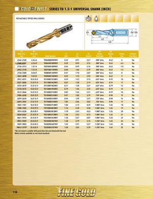 PART SERIES SERIES TD 1.5:1 UNIVERSAL SHANK (INCH) PRAEPRLTASCEERAIEBSLE TIPPED DRILL BODIES D1 D1 D2 D3 Nom. Dia. Nom. Dia. L1 L2 L3 Shank Flange Pocket Coolant inch mm Body Number DOC Ext. Overall Size/Style Dia. Size Thru Point .2362-.2520 6.0-6.4 TD0600009B9R01 0.35 0.91 2.67 .500“ Univ. 0.63 6 Yes Pla.2c5e6h0o-.l2d7e1r7 6.5-6.9 TD0650010B9R01 0.39 0.95 2.72 .500“ Univ. 0.63 6.5 Yes .2756-.2913 7.0-7.4 TD0700010B9R01 0.43 0.99 2.76 .500“ Univ. 0.63 7.0 Yes .2953-.3110 7.5-7.9 TD0750011B9R01 0.44 1.02 2.79 .500“ Univ. 0.63 7.5 Yes .3150-.3504 8.0-8.9 TD0800012B9R01 0.47 1.10 2.87 .500“ Univ. 0.63 8 Yes .3543-.3898 9.0-9.9 TD0900013B9R01 0.55 1.15 2.92 .500“ Univ. 0.63 9 Yes .3937-.4291 10.0-10.9 TD1000015C0R01 0.59 1.23 3.12 .625“ Univ. 0.79 10 Yes .4331-.4685 11.0-11.9 TD1100016C0R01 0.67 1.30 3.19 .625“ Univ. 0.79 11 Yes .4724-.5079 12.0-12.9 TD1200018C0R01 0.71 1.38 3.27 .625“ Univ. 0.79 12 Yes .5118-.5472 13.0-13.9 TD1300019C0R01 0.79 1.46 3.35 .625“ Univ. 0.79 13 Yes .5512-.5866 14.0-14.9 TD1400021C0R01 0.83 1.62 3.51 .625“ Univ. 0.79 14 Yes .5906-.6260 15.0-15.9 TD150002218R01 0.91 1.82 3.79 .750“ Univ. 0.98 15 Yes .6299-.6654 16.0-16.9 TD160002418R01 0.94 1.94 3.91 .750“ Univ. 0.98 16 Yes .6693-.7047 17.0-17.9 TD170002518R01 1.02 2.06 4.03 .750“ Univ. 0.98 17 Yes .7087-.7441 18.0-18.9 TD1800027C8R01 1.06 2.19 4.39 1.000“ Univ. 1.26 18 Yes .7480-.7835 19.0-19.9 TD1900028C8R01 1.14 2.30 4.50 1.000“ Univ. 1.26 19 Yes .7874-.8228 20.0-20.9 TD2000030C8R01 1.18 2.43 4.63 1.000“ Univ. 1.26 20 Yes .8268-.8622 21.0-21.9 TD2100031C8R01 1.26 2.55 4.75 1.000“ Univ. 1.26 21 Yes .8661-.9016 22.0-22.9 TD2200033C8R01 1.30 2.67 4.87 1.000“ Univ. 1.26 22 Yes .9055-.9409 23.0-23.9 TD2300034B7R01 1.38 2.79 5.15 1.250“ Univ. 1.65 23 Yes .9449-.9803 24.0-24.9 TD2400036B7R01 1.42 2.91 5.27 1.250“ Univ. 1.65 24 Yes .9843-1.0197 25.0-25.9 TD2500037B7R01 1.50 3.03 5.39 1.250“ Univ. 1.65 25 Yes *Do not mount a smaller drill point than the one listed with the tool. Metric shanks available as non-stock standard. 118