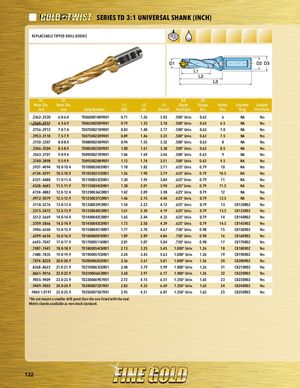 PART SERIES SERIES TD 3:1 UNIVERSAL SHANK (INCH) PRAEPRLTASCEERAIEBSLE TIPPED DRILL BODIES D1 D1 D2 D3 Nom. Dia. Nom. Dia. L1 L2 L3 Shank Flange Pocket Chamfer Coolant inch mm Body Number DOC Ext. Overall Size/Style Dia. Size Ring Thru Point .2362-.2520 6.0-6.4 TD0600018B9R01 0.71 1.26 3.03 .500“ Univ. 0.63 6 NA Yes Pl.a2c5e6h0-o.2ld71e7r 6.5-6.9 TD0650020B9R01 0.79 1.33 3.10 .500“ Univ. 0.63 6.5 NA Yes .2756-.2913 7.0-7.4 TD0700021B9R01 0.83 1.40 3.17 .500“ Univ. 0.63 7.0 NA Yes .2953-.3110 7.5-7.9 TD0750022B9R01 0.89 1.46 3.23 .500“ Univ. 0.63 7.5 NA Yes .3150-.3307 8.0-8.4 TD0800024B9R01 0.94 1.55 3.32 .500“ Univ. 0.63 8 NA Yes .3346-.3504 8.5-8.9 TD0850025B9R01 1.00 1.61 3.38 .500“ Univ. 0.63 8.5 NA Yes .3543-.3701 9.0-9.4 TD0900027B9R01 1.06 1.69 3.46 .500“ Univ. 0.63 9 NA Yes .3740-.3898 9.5-9.9 TD0950028B9R01 1.12 1.74 3.51 .500“ Univ. 0.63 9.5 NA Yes .3937-.4094 10.0-10.4 TD1000030C0R01 1.18 1.82 3.71 .625“ Univ. 0.79 10 NA Yes .4134-.4291 10.5-10.9 TD1050031C0R01 1.26 1.90 3.79 .625“ Univ. 0.79 10.5 NA Yes .4331-.4488 11.0-11.4 TD1100033C0R01 1.30 1.95 3.84 .625“ Univ. 0.79 11 NA Yes .4528-.4685 11.5-11.9 TD1150034C0R01 1.38 2.01 3.90 .625“ Univ. 0.79 11.5 NA Yes .4724-.4882 12.0-12.4 TD1200036C0R01 1.42 2.09 3.98 .625“ Univ. 0.79 12 NA Yes .4912-.5079 12.5-12.9 TD1250037C0R01 1.46 2.15 4.04 .625“ Univ. 0.79 12.5 NA Yes .5118-.5276 13.0-13.4 TD1300039C0R01 1.54 2.23 4.12 .625“ Univ. 0.79 13 CB130R02 Yes .5315-.5472 13.5-13.9 TD1350040C0R01 1.61 2.30 4.19 .625“ Univ. 0.79 13.5 CB135R02 Yes .5512-.5669 14.0-14.4 TD1400042C0R01 1.65 2.44 4.33 .625“ Univ. 0.79 14 CB140R02 Yes .5709-.5866 14.5-14.9 TD1450043C0R01 1.73 2.50 4.39 .625“ Univ. 0.79 14.5 CB145R02 Yes .5906-.6260 15.0-15.9 TD150004518R01 1.77 2.70 4.67 .750“ Univ. 0.98 15 CB150R02 Yes .6299-.6654 16.0-16.9 TD160004818R01 1.89 2.89 4.86 .750“ Univ. 0.98 16 CB160R02 Yes .6693-.7047 17.0-17.9 TD170005118R01 2.01 3.07 5.04 .750“ Univ. 0.98 17 CB170R02 Yes .7087-.7441 18.0-18.9 TD1800054C8R01 2.13 3.25 5.45 1.000“ Univ. 1.26 18 CB180R02 Yes .7480-.7835 19.0-19.9 TD1900057C8R01 2.24 3.43 5.63 1.000“ Univ. 1.26 19 CB190R02 Yes .7874-.8228 20.0-20.9 TD2000060C8R01 2.36 3.61 5.81 1.000“ Univ. 1.26 20 CB200R02 Yes .8268-.8622 21.0-21.9 TD2100063C8R01 2.48 3.79 5.99 1.000“ Univ. 1.26 21 CB210R02 Yes .8661-.9016 22.0-22.9 TD2200066C8R01 2.60 3.97 6.17 1.000“ Univ. 1.26 22 CB220R02 Yes .9055-.9409 23.0-23.9 TD2300069B7R01 2.72 4.15 6.51 1.250“ Univ. 1.65 23 CB230R02 Yes .9449-.9803 24.0-24.9 TD2400072B7R01 2.83 4.33 6.69 1.250“ Univ. 1.65 24 CB240R02 Yes .9843-1.0197 25.0-25.9 TD2500075B7R01 2.95 4.51 6.87 1.250“ Univ. 1.65 25 CB250R02 Yes *Do not mount a smaller drill point than the one listed with the tool. Metric shanks available as non-stock standard. 122