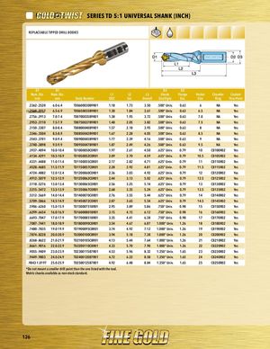 PART SERIES SERIES TD 5:1 UNIVERSAL SHANK (INCH) PRAEPRLTASCEERAIEBSLE TIPPED DRILL BODIES D1 D1 D2 D3 Nom. Dia. Nom. Dia. L1 L2 L3 Shank Flange Pocket Chamfer Coolant inch mm Body Number DOC Ext. Overall Size/Style Dia. Size Ring Thru Point .2362-.2520 6.0-6.4 TD0600030B9R01 1.18 1.73 3.50 .500“ Univ. 0.63 6 NA Yes Pl.a2c5e6h0-o.2ld71e7r 6.5-6.9 TD0650033B9R01 1.30 1.84 3.61 .500“ Univ. 0.63 6.5 NA Yes .2756-.2913 7.0-7.4 TD0700035B9R01 1.38 1.95 3.72 .500“ Univ. 0.63 7.0 NA Yes .2953-.3110 7.5-7.9 TD0750037B9R01 1.48 2.05 3.82 .500“ Univ. 0.63 7.5 NA Yes .3150-.3307 8.0-8.4 TD0800040B9R01 1.57 2.18 3.95 .500“ Univ. 0.63 8 NA Yes .3346-.3504 8.5-8.9 TD0850042B9R01 1.67 2.28 4.05 .500“ Univ. 0.63 8.5 NA Yes .3543-.3701 9.0-9.4 TD0900045B9R01 1.77 2.39 4.16 .500“ Univ. 0.63 9 NA Yes .3740-.3898 9.5-9.9 TD0950047B9R01 1.87 2.49 4.26 .500“ Univ. 0.63 9.5 NA Yes .3937-.4094 10.0-10.4 TD1000050C0R01 1.97 2.61 4.50 .625“ Univ. 0.79 10 CB100R02 Yes .4134-.4291 10.5-10.9 TD1050052C0R01 2.09 2.70 4.59 .625“ Univ. 0.79 10.5 CB105R02 Yes .4331-.4488 11.0-11.4 TD1100055C0R01 2.17 2.82 4.71 .625“ Univ. 0.79 11 CB110R02 Yes .4528-.4685 11.5-11.9 TD1150057C0R01 2.28 2.92 4.81 .625“ Univ. 0.79 11.5 CB115R02 Yes .4724-.4882 12.0-12.4 TD1200060C0R01 2.36 3.03 4.92 .625“ Univ. 0.79 12 CB120R02 Yes .4912-.5079 12.5-12.9 TD1250062C0R01 2.44 3.13 5.02 .625“ Univ. 0.79 12.5 CB125R02 Yes .5118-.5276 13.0-13.4 TD1300065C0R01 2.56 3.25 5.14 .625“ Univ. 0.79 13 CB130R02 Yes .5315-.5472 13.5-13.9 TD1350067C0R01 2.68 3.35 5.24 .625“ Univ. 0.79 13.5 CB135R02 Yes .5512-.5669 14.0-14.4 TD1400070C0R01 2.76 3.55 5.44 .625“ Univ. 0.79 14 CB140R02 Yes .5709-.5866 14.5-14.9 TD1450072C0R01 2.87 3.65 5.54 .625“ Univ. 0.79 14.5 CB145R02 Yes .5906-.6260 15.0-15.9 TD150007518R01 2.95 3.89 5.86 .750“ Univ. 0.98 15 CB150R02 Yes .6299-.6654 16.0-16.9 TD160008018R01 3.15 4.15 6.12 .750“ Univ. 0.98 16 CB160R02 Yes .6693-.7047 17.0-17.9 TD170008518R01 3.35 4.41 6.38 .750“ Univ. 0.98 17 CB170R02 Yes .7087-.7441 18.0-18.9 TD1800090C8R01 3.54 4.67 6.87 1.000“ Univ. 1.26 18 CB180R02 Yes .7480-.7835 19.0-19.9 TD1900095C8R01 3.74 4.92 7.12 1.000“ Univ. 1.26 19 CB190R02 Yes .7874-.8228 20.0-20.9 TD2000100C8R01 3.94 5.18 7.38 1.000“ Univ. 1.26 20 CB200R02 Yes .8268-.8622 21.0-21.9 TD2100105C8R01 4.13 5.44 7.64 1.000“ Univ. 1.26 21 CB210R02 Yes .8661-.9016 22.0-22.9 TD2200110C8R01 4.33 5.70 7.90 1.000“ Univ. 1.26 22 CB220R02 Yes .9055-.9409 23.0-23.9 TD2300115B7R01 4.53 5.96 8.32 1.250“ Univ. 1.65 23 CB230R02 Yes .9449-.9803 24.0-24.9 TD2400120B7R01 4.72 6.22 8.58 1.250“ Univ. 1.65 24 CB240R02 Yes .9843-1.0197 25.0-25.9 TD2500125B7R01 4.92 6.48 8.84 1.250“ Univ. 1.65 25 CB250R02 Yes *Do not mount a smaller drill point than the one listed with the tool. Metric shanks available as non-stock standard. 126