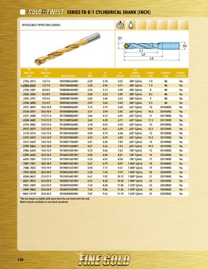 PART SERIES SERIES TD 8:1 CYLINDRICAL SHANK (INCH) PRAEPRLTASCEERAIEBSLE TIPPED DRILL BODIES D1 D1 D2 Nom. Dia. Nom. Dia. L1 L2 L3 Shank Pocket Chamfer Coolant inch mm Body Number DOC Ext. Overall Size/Style Size Ring Thru Point .2756-.2913 7.0-7.4 TD0700056S4R01 2.20 2.78 4.55 .500“ Cylind. 7.0 NA Yes Pla.2c9e5h3o-.l3d1e1r0 7.5-7.9 TD0750060S4R01 2.28 2.94 4.71 .500“ Cylind. 7.5 NA Yes .3150-.3307 8.0-8.4 TD0800064S4R01 2.52 3.13 4.90 .500“ Cylind. 8 NA Yes .3346-.3504 8.5-8.9 TD0850068S4R01 2.68 3.32 5.09 .500“ Cylind. 8.5 NA Yes .3543-.3701 9.0-9.4 TD0900072S4R01 2.83 3.46 5.23 .500“ Cylind. 9 NA Yes .3740-.3898 9.5-9.9 TD0950076S4R01 2.99 3.65 5.42 .500“ Cylind. 9.5 NA Yes .3937-.4094 10.0-10.4 TD1000080S6R01 3.15 3.79 5.68 .625“ Cylind. 10 CB100R02 Yes .4134-.4291 10.5-10.9 TD1050084S6R01 3.31 3.94 5.83 .625“ Cylind. 10.5 CB105R02 Yes .4331-.4488 11.0-11.4 TD1100088S6R01 3.46 4.12 6.01 .625“ Cylind. 11 CB110R02 Yes .4528-.4685 11.5-11.9 TD1150092S6R01 3.62 4.28 6.17 .625“ Cylind. 11.5 CB115R02 Yes .4724-.4882 12.0-12.4 TD1200096S6R01 3.78 4.45 6.34 .625“ Cylind. 12 CB120R02 Yes .4912-.5079 12.5-12.9 TD1250100S6R01 3.94 4.61 6.50 .625“ Cylind. 12.5 CB125R02 Yes .5118-.5276 13.0-13.4 TD1300104S6R01 4.09 4.79 6.68 .625“ Cylind. 13 CB130R02 Yes .5315-.5472 13.5-13.9 TD1350108S6R01 4.25 4.94 6.83 .625“ Cylind. 13.5 CB135R02 Yes .5512-.5669 14.0-14.4 TD1400112S6R01 4.41 5.20 7.09 .625“ Cylind. 14 CB140R02 Yes .5709-.5866 14.5-14.9 TD1450116S6R01 4.57 5.36 7.25 .625“ Cylind. 14.5 CB145R02 Yes .5906-.6260 15.0-15.9 TD1500120S7R01 4.72 5.66 7.63 .750“ Cylind. 15 CB150R02 Yes .6299-.6654 16.0-16.9 TD1600128S7R01 5.04 6.04 8.01 .750“ Cylind. 16 CB160R02 Yes .6693-.7047 17.0-17.9 TD1700136S7R01 5.35 6.41 8.38 .750“ Cylind. 17 CB170R02 Yes .7087-.7441 18.0-18.9 TD1800144S1R01 5.67 6.79 8.99 1.000“ Cylind. 18 CB180R02 Yes .7480-.7835 19.0-19.9 TD1900152S1R01 5.98 7.17 9.37 1.000“ Cylind. 19 CB190R02 Yes .7874-.8228 20.0-20.9 TD2000160S1R01 6.30 7.54 9.74 1.000“ Cylind. 20 CB200R02 Yes .8268-.8622 21.0-21.9 TD2100168S1R01 6.61 7.92 10.12 1.000“ Cylind. 21 CB210R02 Yes .8661-.9016 22.0-22.9 TD2200176S1R01 6.93 8.30 10.50 1.000“ Cylind. 22 CB220R02 Yes .9055-.9409 23.0-23.9 TD2300184S9R01 7.24 8.68 11.04 1.250“ Cylind. 23 CB230R02 Yes .9449-.9803 24.0-24.9 TD2400192S9R01 7.56 9.06 11.42 1.250“ Cylind. 24 CB240R02 Yes .9843-1.0197 25.0-25.9 TD2500200S9R01 7.87 9.43 11.79 1.250“ Cylind. 25 CB250R02 Yes *Do not mount a smaller drill point than the one listed with the tool. Metric shanks available as non-stock standards. 128