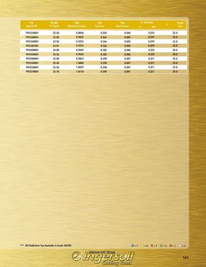 TPASteels & GP TPA-M2 TMA TKA"P" SteelsStainless & ExoticsCast IronTNANon-FerrousDDiameterinmmSPocketSize TPF2250R01 22.50 0.8858 0.350 0.044 0.292 22.0 TPF2300R01 23.00 0.9055 0.366 0.045 0.299 23.0 TPF2350R01 23.50 0.9252 0.366 0.045 0.299 23.0 TPF2381R01 23.81 0.9375 0.366 0.045 0.299 23.0 TFP2400R01 24.00 0.9449 0.382 0.046 0.320 24.0 TPF2450R01 24.50 0.9646 0.382 0.046 0.320 24.0 TPF2500R01 25.00 0.9843 0.398 0.047 0.321 25.0 TPF2540R01 25.40 1.0000 0.398 0.047 0.321 25.0 TPF2550R01 25.50 1.0039 0.398 0.047 0.321 25.0 TPF2570R01 25.70 1.0118 0.398 0.047 0.321 25.0 *** All FlatBottom Tips Available in Grade IN2505 =P =M =K =N =S =H 141
