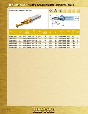 PART SERIES SERIES TC TAP DRILL/CHAMFER BODIES METRIC SHANK PTAPRTDSREIRLLIE/CSHAMFER REPLACEABLE TIPPED BODIES D1Body NumberThreadSizeNominalPoint Size(inch, mm)D1PointRangeL1Full Dia.to ChamferL2Full Dia.to Top ofChamferL3Ext.L4OALD2Shank Dia.(mm, inch)D3D4ChamferFlangeDia.Dia.PocketSize PTlaCc0e6h80o0ld21eJrCR01 M08 0.268“, 6.80mm .2560-.2717 0.827 1.050 1.772 3.75 12.00mm, 0.472“ 0.532 0.63 6.5 TC0850026JCR01 M10 0.335“, 8.50mm .3346-.3504 1.024 1.200 1.960 3.73 12.00mm, 0.472“ 0.610 0.63 8.5 TC1020030JDR01 M12 0.402“, 10.20mm .3937-.4094 1.181 1.360 2.130 4.02 16.00mm, 0.630“ 0.669 0.787 10 TC1200035JDR01 M14 0.472“, 12.00mm .4724-.4882 1.378 1.560 2.400 4.29 16.00mm, 0.630“ 0.748 0.787 12 TC1400039JER01 M16 0.551“, 14.00mm .5512-.5669 1.535 1.710 2.720 4.69 20.00mm, 0.787“ 0.827 0.984 14 TC1750042JER01 M20 0.689“, 17.50mm .6693-.7047 1.653 1.830 2.830 4.80 20.00mm, 0.787“ 0.965 0.984 17 TC2100048JFR01 M24 0.827“, 21.00mm .8268-.8622 1.890 2.070 3.150 5.35 25.00mm, 0.984“ 1.102 1.259 21 144