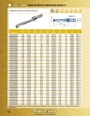 PART SERIES SERIES CD UNIV EXT LENGTH INCH SHANK 5:1 PCAORMTBSIENRAITEISON REPLACEABLE TIP & INDEXABLE INSERT DRILL D1 D1 L1 L2 L3 D2 D3 L4 Nom. Dia. Nom. Dia. Drilling Ext. frm Overall Shank Flange Shank Insert Tip Part Number inch mm Length Holder Length Style/Size Diameter Length Series Series CD2600130N6R01 1.024 26.0mm 5.12 7.23 10.38 1.250 Univ 1.772 3.16 SPGX06_ TPA15_-C PClaDc2e6h2o0l1d3e1rN6R01 1.032 26.2mm 5.16 7.23 10.38 1.250 Univ 1.772 3.16 SPGX06_ TPA15_-C CD2700135N6R01 1.063 27.0mm 5.32 7.47 10.62 1.250 Univ 1.772 3.16 SPGX06_ TPA16_-C CD2780139N6R01 1.095 27.8mm 5.47 7.47 10.62 1.250 Univ 1.772 3.16 SPGX06_ TPA16_-C CD2800140N6R01 1.102 28.0mm 5.51 7.71 10.86 1.250 Univ 1.772 3.16 SPGX06_ TPA17_-C CD2860143N6R01 1.126 28.6mm 5.63 7.71 10.86 1.250 Univ 1.772 3.16 SPGX06_ TPA17_-C CD2900145N6R01 1.142 29.0mm 5.71 7.88 11.03 1.250 Univ 2.165 3.16 SPGX07_ TPA15_-C CD2940147N6R01 1.158 29.4mm 5.79 7.88 11.03 1.250 Univ 2.165 3.16 SPGX07_ TPA15_-C CD3000150N6R01 1.181 30.0mm 5.91 8.12 11.27 1.250 Univ 2.165 3.16 SPGX07_ TPA16_-C CD3020151N6R01 1.189 30.2mm 5.95 8.12 11.27 1.250 Univ 2.165 3.16 SPGX07_ TPA16_-C CD3100155N6R01 1.221 31.0mm 6.10 8.36 11.51 1.250 Univ 2.165 3.16 SPGX07_ TPA17_-C CD3180159N6R01 1.252 31.8mm 6.26 8.36 11.51 1.250 Univ 2.165 3.16 SPGX07_ TPA17_-C CD3200160N6R01 1.260 32.0mm 6.30 8.60 11.75 1.250 Univ 2.165 3.16 SPGX07_ TPA18_-C CD3250163N6R01 1.280 32.5mm 6.42 8.60 11.75 1.250 Univ 2.165 3.16 SPGX07_ TPA18_-C CD3300165N6R01 1.299 33.0mm 6.50 7.93 10.61 1.250 Univ 2.165 3.16 SPGX09_ TPA15_-C CD3330167N6R01 1.311 33.3mm 6.58 8.87 12.02 1.250 Univ 2.165 3.16 SPGX09_ TPA15_-C CD3400170N6R01 1.339 34.0mm 6.69 9.11 12.26 1.250 Univ 2.165 3.16 SPGX09_ TPA16_-C CD3410171N6R01 1.343 34.1mm 6.73 9.11 12.26 1.250 Univ 2.165 3.16 SPGX09_ TPA16_-C CD3490175N6R01 1.374 34.9mm 6.89 9.11 12.26 1.250 Univ 2.165 3.16 SPGX09_ TPA16_-C CD3500175N6R01 1.378 35.0mm 6.89 9.35 12.50 1.250 Univ 2.165 3.16 SPGX09_ TPA17_-C CD3570179N6R01 1.406 35.7mm 7.05 9.35 12.50 1.250 Univ 2.165 3.16 SPGX09_ TPA17_-C CD3600180N6R01 1.417 36.0mm 7.09 9.59 12.74 1.250 Univ 2.165 3.16 SPGX09_ TPA18_-C CD3650182N6R01 1.437 36.5mm 7.17 9.59 12.74 1.250 Univ 2.165 3.16 SPGX09_ TPA18_-C CD3700185N6R01 1.457 37.0mm 7.28 9.76 12.91 1.250 Univ 2.165 3.16 SPGX11_ TPA16_-C CD3730186N6R01 1.469 37.3mm 7.32 9.76 12.91 1.250 Univ 2.165 3.16 SPGX11_ TPA16_-C CD3800190N6R01 1.496 38.0mm 7.48 10.00 13.15 1.250 Univ 2.165 3.16 SPGX11_ TPA17_-C CD3810191N6R01 1.500 38.1mm 7.52 10.00 13.15 1.250 Univ 2.165 3.16 SPGX11_ TPA17_-C CD3890194N6R01 1.532 38.9mm 7.64 10.00 13.15 1.250 Univ 2.165 3.16 SPGX11_ TPA17_-C CD3900195N6R01 1.535 39.0mm 7.68 10.24 13.39 1.250 Univ 2.165 3.16 SPGX11_ TPA18_-C CD3970198N6R01 1.563 39.7mm 7.80 10.24 13.39 1.250 Univ 2.165 3.16 SPGX11_ TPA18_-C CD4000200N6R01 1.575 40.0mm 7.87 10.47 13.62 1.250 Univ 2.165 3.16 SPGX11_ TPA19_-C CD4050202N6R01 1.595 40.5mm 7.95 10.47 13.62 1.250 Univ 2.165 3.16 SPGX11_ TPA19_-C CD4100205N6R01 1.614 41.0mm 8.07 10.71 13.86 1.250 Univ 2.165 3.16 SPGX11_ TPA20_-C CD4130206N6R01 1.626 41.3mm 8.11 10.71 13.86 1.250 Univ 2.165 3.16 SPGX11_ TPA20_-C CD4200210N6R01 1.654 42.0mm 8.27 10.95 14.10 1.250 Univ 2.165 3.16 SPGX11_ TPA21_-C CD4280214N6R01 1.685 42.8mm 8.43 10.95 14.10 1.250 Univ 2.165 3.16 SPGX11_ TPA21_-C CD4300215N7R01 1.693 43.0mm 8.47 11.19 14.34 1.500 Univ 2.362 3.16 SPGX11_ TPA22_-C CD4370218N7R01 1.720 43.7mm 8.58 11.19 14.34 1.500 Univ 2.362 3.16 SPGX11_ TPA22_-C CD4400220N7R01 1.732 44.0mm 8.66 11.43 14.58 1.500 Univ 2.362 3.16 SPGX11_ TPA23_-C CD4450222N7R01 1.752 44.5mm 8.74 11.43 14.58 1.500 Univ 2.362 3.16 SPGX11_ TPA23_-C CD4500225N7R01 1.772 45.0mm 8.86 11.67 14.82 1.500 Univ 2.362 3.16 SPGX11_ TPA24_-C CD4520226N7R01 1.780 45.2mm 8.90 11.67 14.82 1.500 Univ 2.362 3.16 SPGX11_ TPA24_-C Do not mount a smaller drill point than the one listed with the tool. Standard Gold-Twist tips do not fit in the Gold Twin. Gold-Twin use a modified standard Gold-Twist tip, designation R01-C. 150