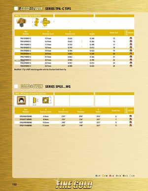 GradesGrades PART SERIES SERIES TPA -C TIPS TPA-C Replaceable Tip for Gold-Twin PART SERIES Part D D tNumberDiameter (mm)Diameter (in)LengthPocket SizeIN2505 TPA1590R01-C 15.9mm 0.626 0.344 15 TPA1690R01-C 16.9mm 0.665 0.366 16 TPA1790R01-C 17.9mm 0.705 0.390 17 TPA1890R01-C 18.9mm 0.744 0.413 18 TPA1990R0a1sd-Cf 19.9mm 0.784 0.433 19 TPA2090R01-C 20.9mm 0.823 0.344 20 TPA2190R01-C 21.9mm 0.862 0.366 21 PlacehoTPldA2e2r 90R01-C 22.9mm 0.902 0.390 22 TPA2390R01-C 23.9mm 0.941 0.413 23 TPA2490R01-C 24.9mm 0.980 0.433 24 Modified -C Tip is NOT interchangeable with the Standard Gold-Twist Tip. SERIES SPGX...WG SPGX...WG Peripheral Inserts for Gold-Twin r D1 d t PartNumber D D TDiameter (mm)Diameter (in)ThicknessRRadiusPocket Size IN2505 SPGX060204WG 6.0mm .239" .094" .016" 6 SPGX07T308WG 8.0mm .316" .156" .031" 7 SPGX090408WG 10.0mm .390" .169" .031" 9 SPGX110408WG 11.6mm .457" .190" .031" 11 =P =M =K =N =S =H 152