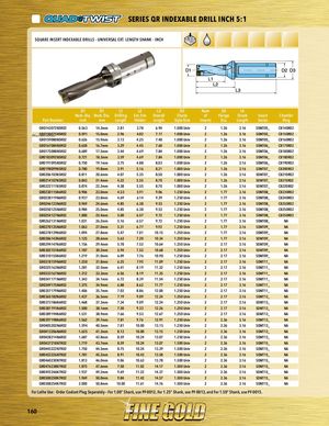 PART SERIES SERIES QR INDEXABLE DRILL INCH 5:1 PSQARUTASREERIINESERT INDEXABLE DRILLS - UNIVERSAL EXT. LENGTH SHANK - INCH D1 D1 L1 L2 L3 D2 Num D3 L4 Nom. Dia. Nom. Dia. Drilling Ext. frm Overall Shank of Flange Shank Insert Chamfer Part Number inch mm Length Holder Length Style/Size Inserts Dia. Length Series Ring QR0143072N5R02 0.563 14.3mm 2.81 3.78 6.94 1.000 Univ 2 1.26 3.16 SOMT05_ CB140R02 PlacQeRh0o15ld00e7r5N5R02 0.591 15.0mm 2.96 4.02 7.17 1.000 Univ 2 1.26 3.16 SOMT05_ CB150R02 QR0159080N5R02 0.626 15.9mm 3.13 4.25 7.40 1.000 Univ 2 1.26 3.16 SOMT05_ CB160R02 QR0167084N5R02 0.658 16.7mm 3.29 4.45 7.60 1.000 Univ 2 1.26 3.16 SOMT06_ CB170R02 QR0175088N5R02 0.689 17.5mm 3.44 4.69 7.84 1.000 Univ 2 1.26 3.16 SOMT06_ CB180R02 QR0183092N5R02 0.721 18.3mm 3.59 4.69 7.84 1.000 Univ 2 1.26 3.16 SOMT06_ CB180R02 QR0191095N5R02 0.750 19.1mm 3.75 4.88 8.03 1.000 Univ 2 1.26 3.16 SOMT06_ CB190R02 QR0198099N5R02 0.780 19.8mm 3.91 5.16 8.31 1.000 Univ 2 1.26 3.16 SOMT07_ CB200R02 QR0206103N5R02 0.811 20.6mm 4.07 5.35 8.50 1.000 Univ 2 1.26 3.16 SOMT07_ CB210R02 QR0214107N5R02 0.843 21.4mm 4.22 5.55 8.70 1.000 Univ 2 1.26 3.16 SOMT07_ CB210R02 QR0222111N5R02 0.874 22.2mm 4.38 5.55 8.70 1.000 Univ 2 1.26 3.16 SOMT07_ CB220R02 QR0230115N6R02 0.906 23.0mm 4.53 5.91 9.06 1.250 Univ 2 1.77 3.16 SOMT08_ CB230R02 QR0238119N6R02 0.937 23.8mm 4.69 6.14 9.29 1.250 Univ 2 1.77 3.16 SOMT08_ CB240R02 QR0246123N6R02 0.969 24.6mm 4.85 6.38 9.53 1.250 Univ 2 1.77 3.16 SOMT08_ CB250R02 QR0250125N6R02 0.984 25.0mm 4.85 6.38 9.53 1.250 Univ 2 1.77 3.16 SOMT08_ CB250R02 QR0254127N6R02 1.000 25.4mm 5.00 6.57 9.72 1.250 Univ 2 1.77 3.16 SOMT08_ CB250R02 QR0262131N6R02 1.031 26.2mm 5.16 6.57 9.72 1.250 Univ 2 1.77 3.16 SOMT08_ NA QR0270135N6R02 1.063 27.0mm 5.31 6.77 9.92 1.250 Univ 2 1.77 3.16 SOMT09_ NA QR0278139N6R02 1.094 27.8mm 5.47 7.01 10.15 1.250 Univ 2 1.77 3.16 SOMT09_ NA QR0286143N6R02 1.125 28.6mm 5.63 7.20 10.34 1.250 Univ 2 1.77 3.16 SOMT09_ NA QR0294147N6R02 1.156 29.4mm 5.78 7.52 10.64 1.250 Univ 2 2.17 3.16 SOMT09_ NA QR0302151N6R02 1.187 30.2mm 5.94 7.52 10.68 1.250 Univ 2 2.17 3.16 SOMT09_ NA QR0310155N6R02 1.219 31.0mm 6.09 7.76 10.90 1.250 Univ 2 2.17 3.16 SOMT09_ NA QR0318159N6R02 1.250 31.8mm 6.25 7.95 11.09 1.250 Univ 2 2.17 3.16 SOMT11_ NA QR0325163N6R02 1.281 32.5mm 6.41 8.19 11.32 1.250 Univ 2 2.17 3.16 SOMT11_ NA QR0333167N6R02 1.312 33.3mm 6.56 8.19 11.35 1.250 Univ 2 2.17 3.16 SOMT11_ NA QR0341171N6R02 1.343 34.1mm 6.72 8.39 11.54 1.250 Univ 2 2.17 3.16 SOMT11_ NA QR0349175N6R02 1.375 34.9mm 6.88 8.62 11.77 1.250 Univ 2 2.17 3.16 SOMT11_ NA QR0357179N6R02 1.406 35.7mm 7.03 8.86 12.00 1.250 Univ 2 2.17 3.16 SOMT11_ NA QR0365182N6R02 1.437 36.5mm 7.19 9.09 12.24 1.250 Univ 2 2.17 3.16 SOMT13_ NA QR0373186N6R02 1.468 37.3mm 7.34 9.09 12.24 1.250 Univ 2 2.17 3.16 SOMT13_ NA QR0381191N6R02 1.500 38.1mm 7.50 9.33 12.26 1.250 Univ 2 2.17 3.16 SOMT13_ NA QR0389194N6R02 1.531 38.9mm 7.66 9.53 12.67 1.250 Univ 2 2.17 3.16 SOMT13_ NA QR0397198N6R02 1.562 39.7mm 7.81 9.76 12.91 1.250 Univ 2 2.36 3.16 SOMT13_ NA QR0405202N6R02 1.594 40.5mm 7.81 10.00 13.15 1.250 Univ 2 2.36 3.16 SOMT13_ NA QR0413206N6R02 1.625 41.3mm 8.13 10.00 13.15 1.250 Univ 2 2.36 3.16 SOMT13_ NA QR0428214N6R02 1.687 42.8mm 8.59 10.24 13.07 1.250 Univ 2 2.36 3.16 SOMT13_ NA QR0437218N7R02 1.719 43.7mm 8.59 10.24 13.07 1.500 Univ 2 2.36 3.16 SOMT15_ NA QR0445222N7R02 1.750 44.5mm 8.75 10.24 13.39 1.500 Univ 2 2.36 3.16 SOMT15_ NA QR0452226N7R02 1.781 45.2mm 8.91 10.43 13.58 1.500 Univ 2 2.36 3.16 SOMT15_ NA QR0460230N7R02 1.813 46.0mm 9.06 10.63 13.78 1.500 Univ 2 2.36 3.16 SOMT15_ NA QR0476238N7R02 1.875 47.6mm 7.50 11.02 14.17 1.500 Univ 2 2.36 3.16 SOMT15_ NA QR0492246N7R02 1.937 49.2mm 9.69 11.22 14.37 1.500 Univ 2 2.36 3.16 SOMT15_ NA QR0500250N7R02 1.969 50.0mm 9.84 11.42 14.57 1.500 Univ 2 2.36 3.16 SOMT15_ NA QR0508254N7R02 2.000 50.8mm 10.00 11.61 14.76 1.500 Univ 2 2.36 3.16 SOMT15_ NA For Lathe Use: Order Coolant Plug Separately – For 1.00” Shank, use PF-0012, For 1.25” Shank, use PF-0013, and For 1.50” Shank, use PF-0015. 160