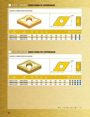 Grades Grades CT3000 TT5100 TT8115 TT8125 TT8135 PART SERIES SERIES DNMG FG CHIPBREAKER PNAERGTATSIEVREIE5S5° RHOMBIC INSERTS FOR FINISHING 55° D R L T ANSINumber asdf ISONumber feed feed ap ap LminmaxminmaxD T R TT5100 TT8115 TT8125 DNMG3.53.51FG DNMG130504FG .003 .012 .008 .079 .511 .438 .219 .016 PDlaNcMehGo3.l5d3e.5r2FG DNMG130508FG .004 .014 .020 .079 .489 .438 .219 .031 DNMG3.53.53FG DNMG130512FG .006 .016 .020 .079 .466 .438 .219 .047 SERIES DNMG FM CHIPBREAKER NEGATIVE 55° RHOMBIC INSERTS FOR FINISHING PART SERIES 55° PART SERIES D R L T ANSI ISO feed feed ap ap L D T R Number Number min max min max DNMG3.53.51FM DNMG130504FM .003 .012 .010 .079 .511 .438 .219 .016 DNMG3.53.52FM DNMG130508FM .004 .014 .012 .079 .489 .438 .219 .031 DNMG3.53.53FMasdf DNMG130512FM .006 .016 .014 .079 .466 .438 .219 .047 Placeholder =P =M =K =N =S =H 184