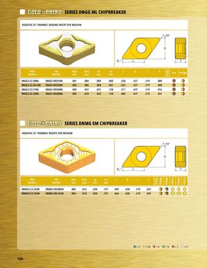 Grades TT5080 GradesTT9080 TT9215 TT9225 TT9235 PART SERIES SERIES DNGG ML CHIPBREAKER PNAERGTATSIEVREIE5S5° RHOMBIC GROUND INSERT FOR MEDIUM 55° D R L T ANSINumberasdf ISONumber feed feed ap ap L D T Rminmaxminmax K10 TT5080 DNGG3.53.50ML DNGG130501ML .001 .004 .004 .040 .528 .437 .219 .004 PDlaNcGeGh3o.5ld3e.5r0.5ML DNGG130502ML .002 .006 .008 .047 .523 .437 .219 .008 DNGG3.53.51ML DNGG130504ML .004 .012 .031 .138 .511 .437 .219 .016 DNGG3.53.52ML DNGG130508ML .005 .014 .039 .138 .489 .437 .219 .031 SERIES DNMG EM CHIPBREAKER NEGATIVE 55° RHOMBIC INSERTS FOR MEDIUM PART SERIES 55° PART SERIES D R L T ANSI ISO feed feed ap ap L D T R Number Number min max min max DNMG3.53.52EM DNMG130508EM .005 .016 .020 .157 .489 .438 .219 .031 DNMG3.53.53EMasdf DNMG130512EM .006 .016 .028 .157 .466 .438 .219 .047 Placeholder =P =M =K =N =S =H 186