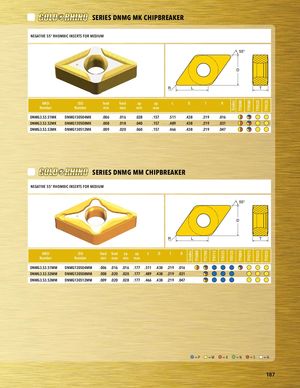 Grades TT5080 TT5100 TT8115 TT8125 GradesTT8135 TT5080TT9080 TT9080TT9215 TT9225TT9225 TT9235TT9235 PART SERIES SERIES DNMG MK CHIPBREAKER PNAERGTATSIEVREIE5S5° RHOMBIC INSERTS FOR MEDIUM 55° D R L T ANSINumberasdf ISONumber feed feed ap ap L D T Rminmaxminmax DNMG3.53.51MK DNMG130504MK .006 .016 .028 .157 .511 .438 .219 .016 PDlaNcMehGo3.l5d3e.5r2MK DNMG130508MK .008 .018 .040 .157 .489 .438 .219 .031 DNMG3.53.53MK DNMG130512MK .009 .020 .060 .157 .466 .438 .219 .047 SERIES DNMG MM CHIPBREAKER NEGATIVE 55° RHOMBIC INSERTS FOR MEDIUM PART SERIES 55° PART SERIES D R L T ANSI ISO feed feed ap ap L D T R Number Number min max min max DNMG3.53.51MM DNMG130504MM .006 .016 .016 .177 .511 .438 .219 .016 DNMG3.53.52MM DNMG130508MM .008 .020 .020 .177 .489 .438 .219 .031 DNMG3.53.53MMasdf DNMG130512MM .009 .020 .028 .177 .466 .438 .219 .047 Placeholder =P =M =K =N =S =H 187