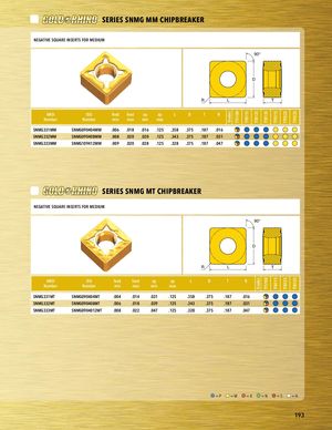 Grades TT5100 TT8115 TT8125Grades TT8135TT5100 TT9215TT8115 TT9225TT8125 TT9235TT8135 PART SERIES SERIES SNMG MM CHIPBREAKER PNAERGTATSIEVREIESSQUARE INSERTS FOR MEDIUM 90° D R L T ANSINumber asdf ISONumber feed feed ap ap L D T Rminmaxminmax SNMG331MM SNMG090404MM .006 .018 .016 .125 .358 .375 .187 .016 PSlaNcMeGh3o3ld2MerM SNMG090408MM .008 .020 .020 .125 .343 .375 .187 .031 SNMG333MM SNMG109412MM .009 .020 .028 .125 .328 .375 .187 .047 SERIES SNMG MT CHIPBREAKER NEGATIVE SQUARE INSERTS FOR MEDIUM PART SERIES 90° PART SERIES D R L T ANSI ISO feed feed ap ap L D T R Number Number min max min max SNMG331MT SNMG090404MT .004 .014 .031 .125 .358 .375 .187 .016 SNMG332MT SNMG090408MT .006 .018 .039 .125 .343 .375 .187 .031 SNMG333MT asdf SNMG0904012MT .008 .022 .047 .125 .328 .375 .187 .047 Placeholder =P =M =K =N =S =H 193