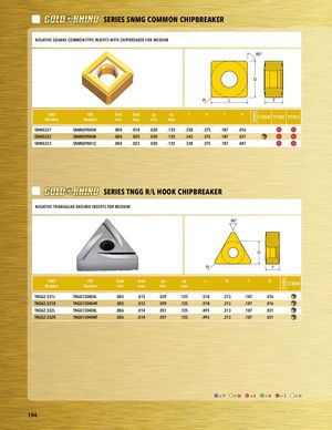 Grades Grades PART SERIES SERIES SNMG COMMON CHIPBREAKER PNAERGTATSIEVREIESSQUARE COMMON-TYPE INSERTS WITH CHIPBREAKER FOR MEDIUM 90° D R L T ANSINumber asdf ISONumber feed feed ap ap LminmaxminmaxD T R CT3000 TT7005 TT7015 SNMG331 SNMG090404 .004 .018 .020 .125 .358 .375 .187 .016 PSlaNcMeGh3o3ld2 er SNMG090408 .004 .020 .020 .125 .343 .375 .187 .031 SNMG333 SNMG090412 .004 .022 .020 .125 .328 .375 .187 .047 SERIES TNGG R/L HOOK CHIPBREAKER NEGATIVE TRIANGULAR GROUND INSERTS FOR MEDIUM PART SERIES 60° PART SERIES D R T ANSINumber ISONumber feed feed ap ap LminmaxminmaxD T R CT3000 TNGG2.531L TNGG130404L .005 .012 .039 .125 .518 .313 .187 .016 TNGG2.531R TNGG130404R .005 .012 .039 .125 .518 .313 .187 .016 TNGG2.532L asdf TNGG130408L .006 .014 .051 .125 .495 .313 .187 .031 TNGG2.532R TNGG130408R .006 .014 .051 .125 .495 .313 .187 .031 Placeholder =P =M =K =N =S =H 194