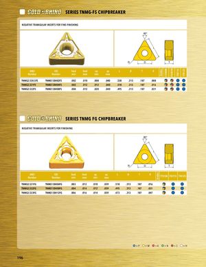 Grades Grades CT3000 PV3010 TT8115 TT8125 PART SERIES SERIES TNMG-FS CHIPBREAKER PNAERGTATSIEVREIETSRIANGULAR INSERTS FOR FINE-FINISHING 60° L R D T ANSINumber asdf ISONumber feed feed ap ap L D T Rminmaxminmax TNMG2.530.5FS TNMG130402FS .002 .010 .008 .040 .530 .313 .187 .008 PTlaNcMeGh2o.5ld3e1FrS TNMG130404FS .003 .012 .012 .040 .518 .313 .187 .016 TNMG2.532FS TNMG130408FS .004 .012 .020 .040 .495 .313 .187 .031 SERIES TNMG FG CHIPBREAKER NEGATIVE TRIANGULAR INSERTS FOR FINISHING PART SERIES 60° PART SERIES L R D T ANSINumber ISONumber feed feed ap ap LminmaxminmaxD T R TT5100 TT8115 TT8125 TNMG2.531FG TNMG130404FG .003 .012 .010 .059 .518 .313 .187 .016 TNMG2.532FG TNMG130408FG .004 .014 .012 .059 .495 .313 .187 .031 TNMG2.533FG asdf TNMG130412FG .006 .016 .014 .059 .473 .313 .187 .047 Placeholder =P =M =K =N =S =H 196