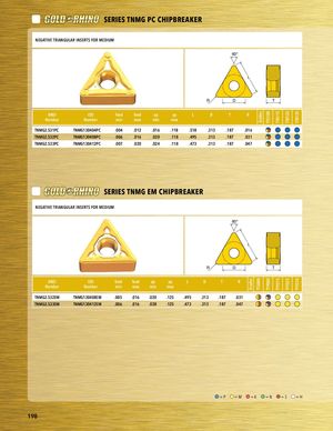 Grades GradesTT5080 TT5100TT9080 TT8115TT9215 TT8125TT9225 TT8135TT9235 PART SERIES SERIES TNMG PC CHIPBREAKER PNAERGTATSIEVREIETSRIANGULAR INSERTS FOR MEDIUM 60° L R D T ANSINumber asdf ISONumber feed feed ap ap L D T Rminmaxminmax TNMG2.531PC TNMG130404PC .004 .012 .016 .118 .518 .313 .187 .016 PTlaNcMeGh2o.5ld3e2Pr C TNMG130408PC .006 .016 .020 .118 .495 .313 .187 .031 TNMG2.533PC TNMG130412PC .007 .020 .024 .118 .473 .313 .187 .047 SERIES TNMG EM CHIPBREAKER NEGATIVE TRIANGULAR INSERTS FOR MEDIUM PART SERIES 60° PART SERIES L R D T ANSI ISO feed feed ap ap L D T R Number Number min max min max TNMG2.532EM TNMG130408EM .005 .016 .020 .125 .495 .313 .187 .031 TNMG2.533EM TNMG130412EM .006 .016 .028 .125 .473 .313 .187 .047 asdf Placeholder =P =M =K =N =S =H 198