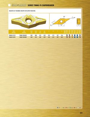 Grades CT3000 PV3010 TT5080 TT8105 TT8115 TT9080 PART SERIES SERIES YNMG FS CHIPBREAKER PNAERGTATSIEVREIE2S5° RHOMBIC INSERTS FOR SUPER-FINISHING 35° 25° L R D T ANSINumber asdf ISONumber feed feed ap ap L D T Rminmaxminmax YNMG2.531FS YNMG130404FS .003 .008 .012 .039 .185 .313 .187 .016 PYlaNcMeGh2o.l5d3e2rFS YNMG130408FS .003 .010 .020 .059 .165 .313 .187 .031 =P =M =K =N =S =H 209
