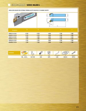 PART SERIES SERIES HDJNR/L PHAOROTKS-ELERVIEESR-HOLDER FOR EXTERNAL TURNING ACCEPTS NEGATIVE 55° RHOMBIC INSERTS H H F B 93° L1 L Designation H B L L1 F HDJNL12-3.53.5B 0.750 0.750 4.500 1.340 1.000 PHlaDcJeNhRo1l2d-3e.r53.5B 0.750 0.750 4.500 1.340 1.000 HDJNL16-3.53.5D 1.000 1.000 6.000 1.340 1.250 HDJNR16-3.53.5D 1.000 1.000 6.000 1.340 1.250 HDJNL20-3.53.5D 1.250 1.250 6.000 1.340 1.500 HDJNR20-3.53.5D 1.250 1.250 6.000 1.340 1.500 HARDWARE Insert Reference Lever Lever Screw Seat Pin Lever Screw Wrench Seat Seat Pin Punch DN_ _3.53.5_ LCL11-NX LCS4 LSP4 L-W3 LSD3.52 SPP3-4 HARDWARE hardware desc 1 hardware desc 2 hardware desc 3 hardware desc 4 hardware desc 5 hardware desc 6 hardware desc 7 211