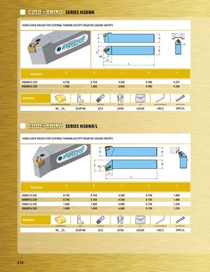 PART SERIES SERIES HSDNN PHAOROTKS-ELERVIEESR HOLDER FOR EXTERNAL TURNING ACCEPTS NEGATIVE SQUARE INSERTS H H F B 45° L1 L Designation H B L L1 F HSDNN12-33B 0.750 0.750 4.500 0.980 0.375 PHlaScDeNhNo1l6d-e3r3D 1.000 1.000 6.000 0.980 0.500 HARDWARE Turning Holder Insert Reference Lever Lever Screw Seat Pin Seat Lever Screw Wrench Seat Pin Punch HARDWARE SN_ _33_ LCL09-NX LCS3 LSP3A LSS32A L-W2.5 SPP3-3L hardware desc 1 hardware desc 2 hardware desc 3 hardware desc 4 hardware desc 5 hardware desc 6 hardware desc 7 SERIES HSKNR/L HOOKP-LAEVRERTHOSLEDERRIFEORSEXTERNAL TURNING ACCEPTS NEGATIVE SQUARE INSERTS PART SERIES H H F 75° B L1 L Designation H B L L1 F HSKNL12-33B 0.750 0.750 4.500 0.750 1.000 HSKNR12-33B 0.750 0.750 4.500 0.750 1.000 HSKNL16-33D 1.000 1.000 6.000 0.750 1.250 HSKNR16-33D 1.000 1.000 6.000 0.750 1.250 Placeholder HARDWARE Insert Reference Lever Lever Screw Seat Pin Seat Lever Screw Wrench Seat Pin Punch HARDWARE SN_ _33_ LCL09-NX LCS3 LSP3A LSS32A L-W2.5 SPP3-3L hardware desc 1 hardware desc 2 hardware desc 3 hardware desc 4 hardware desc 5 hardware desc 6 hardware desc 7 214