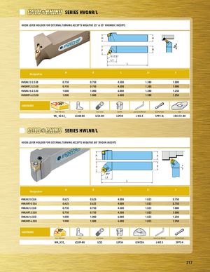 PART SERIES SERIES HVQNR/L PHAOROTKSLEERVIEESR HOLDER FOR EXTERNAL TURNING ACCEPTS NEGATIVE 25° & 35° RHOMBIC INSERTS H H F B 117.5° L1 L Designation H B L L1 F HVQNL12-2.53B 0.750 0.750 4.500 1.380 1.000 PHlaVcQeNhRo1l2d-e2r.53B 0.750 0.750 4.500 1.380 1.000 HVQNL16-2.53D 1.000 1.000 6.000 1.380 1.250 HVQNR16-2.53D 1.000 1.000 6.000 1.380 1.250 HHAARRDDWWAARREE Insert Reference Lever Lever Screw Seat Pin Lever Screw Wrench Seat Pin Punch Seat hardware desc 1 hardware desc 2 hardware desc 3 hardware desc 4 hardware desc 5 hardware desc 6 hardware desc 7 VN_ X2.53_ LCL08-NX LCS4-DH LSP3B L-W2.5 SPP3-3L LSV2.51.8H SERIES HWLNR/L PART SERIES HOOK-LEVER HOLDER FOR EXTERNAL TURNING ACCEPTS NEGATIVE 80° TRIGON INSERTS PART SERIES h h f b 95° L1 L Designation H B L L1 F HWLNL10-33A 0.625 0.625 4.000 1.023 0.750 HWLNR10-33A 0.625 0.625 4.000 1.023 0.750 HWLNL12-33B 0.750 0.750 4.500 1.023 1.000 PHlaWceLNhRo1ld2-e3r3B 0.750 0.750 4.500 1.023 1.000 HWLNL16-33D 1.000 1.000 6.000 1.023 1.250 HWLNR16-33D 1.000 1.000 6.000 1.023 1.250 HHAARRDDWWAARREE hardware desc 1 hardware desc 2 hardware desc 3 hardware desc 4 hardware desc 5 hardware desc 6 hardware desc 7 Insert Reference Lever Lever Screw Seat Pin Seat Lever Screw Wrench Seat Pin Punch WN_X33_ LCL09-NX LCS3 LSP3A LSW32A L-W2.5 SPP3-4 217