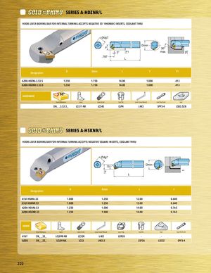 PART SERIES SERIES A-HDZNR/L PHAOROTKS-ELERVIEESR-BORING BAR FOR INTERNAL TURNING ACCEPTS NEGATIVE 55° RHOMBIC INSERTS, COOLANT THRU Ødg7 F Dmin 30° 3° F1 max. .787 L Designation D Dmin L F F1 A20U-HDZNL-3.53.5 1.250 1.750 14.00 1.000 .413 A20U-HDZNR-3.53.5 1.250 1.750 14.00 1.000 .413 Placeholder HARDWARE Insert Reference Lever Lever Screw Seat Pin Lever Screw Wrench Seat Pin Punch Seat DN_ _3.53.5_ LCL11-NX LCS4S LSP4 L-W3 SPP3-4 LSD3.52B SERIES A-HSKNR/L HOOK-LEVER BORING BAR FOR INTERNAL TURNING ACCEPTS NEGATIVE SQUARE INSERTS, COOLANT THRU Ødg7 75° Dmin F L Designation D Dmin L F A16T-HSKNL-33 1.000 1.250 12.00 0.640 A16T-HSKNR-33 1.000 1.250 12.00 0.640 A20U-HSKNL-33 1.250 1.500 14.00 0.765 A20U-HSKNR-33 1.250 1.500 14.00 0.765 HDWR HARDWARE Insert Reference Lever Lever Screw Lever Screw Wrench Lever Clip Seat Pin Seat Seat Pin Punch A16T SN_ _33_ LhCardLw0ar9e Bde-sNc 1X hardLwCarSe3deBsc 2 hardLw-aWre d2esc 3 hardLwSaRre3deBsc 4 hardware- desc 5 hardware- desc 6 hardwar-e desc 7 A20U SN_ _33_ LCL09-NX LCS3 L-W2.5 - LSP3A LSS32 SPP3-4 222