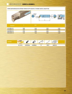 PART SERIES SERIES A-SVUNR/L PSCARETWSE-CRLIEASMP-BORING BAR FOR INTERNAL TURNING ACCEPTS NEGATIVE 35° RHOMBIC INSERTS, COOLANT THRU Ødg7 F 93° Dmin m50a°x. L Designation D Dmin L F A16T-SVUNL-2.53 1.000 1.250 12.00 0.625 PAla1c6eT-hSoVUldNeRr-2.53 1.000 1.250 12.00 0.625 A20U-SVUNL-2.53 1.250 1.500 14.00 0.750 A20U-SVUNR-2.53 1.250 1.500 14.00 0.750 HARDWARE Insert Reference Insert Screw Seat Screw Insert Screw Wrench Seat Screw Wrench Seat VN_ X2.53_ TS30120I/HG TS5030062S T9 L-W3.5 SSVN2.523 HARDWARE hardware desc 1 hardware desc 2 hardware desc 3 hardware desc 4 hardware desc 5 hardware desc 6 hardware desc 7 225