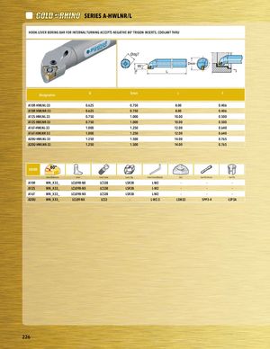PART SERIES SERIES A-HWLNR/L PHAOROTKS-ELERVIEESR BORING BAR FOR INTERNAL TURNING ACCEPTS NEGATIVE 80° TRIGON INSERTS, COOLANT THRU Ødg7 95° Dmin F L Designation D Dmin L F A10R-HWLNL-33 0.625 0.750 8.00 0.406 PAla1c0eRh-HoWldLeNrR-33 0.625 0.750 8.00 0.406 A12S-HWLNL-33 0.750 1.000 10.00 0.500 A12S-HWLNR-33 0.750 1.000 10.00 0.500 A16T-HWLNL-33 1.000 1.250 12.00 0.640 A16T-HWLNR-33 1.000 1.250 12.00 0.640 A20U-HWLNL-33 1.250 1.500 14.00 0.765 A20U-HWLNR-33 1.250 1.500 14.00 0.765 HDWR Insert Reference Lever Lever Screw Lever Clip Lever Screw Wrench Seat Seat Pin Punch Seat Pin A10R WN_X33_ LCL09B-NX LCS3B LSR3B L-W2 - - - A12S WN_X33_ LCL09B-NX LCS3B LSR3B L-W2 - - - A16T WN_X33_ LCL09B-NX LCS3B LSR3B L-W2 - - - A20U WN_X33_ LCL09-NX LCS3 - L-W2.5 LSW32 SPP3-4 LSP3A HARDWARE hardware desc 1 hardware desc 2 hardware desc 3 hardware desc 4 hardware desc 5 hardware desc 6 hardware desc 7 226
