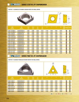 GradesGrades PART SERIES SERIES CCGT R/L FF CHIPBREAKER PAORSTITSIVEREI7E°S CLEARANCE 80° RHOMBIC GROUND INSERTS FOR SMALL BORING 80° D ØD1 7° R T ANSINumber asdf ISONumber feed feed ap ap DminmaxminmaxT R D1 CT3000 TT9020 CCGT1.10.9X0L-FF CCGT0301003L-FF 0.001 0.004 0.002 0.012 0.138 0.055 0.001 0.079 PClaCcGeTh1.o1l0d.9eXr0R-FF CCGT0301003R-FF 0.001 0.004 0.002 0.012 0.138 0.055 0.001 0.079 CCGT1.10.90L-FF CCGT030101L-FF 0.001 0.005 0.003 0.016 0.138 0.055 0.004 0.079 CCGT1.10.90R-FF CCGT030101R-FF 0.001 0.005 0.003 0.016 0.138 0.055 0.004 0.079 CCGT1.10.90.5L-FF CCGT030102L-FF 0.001 0.006 0.004 0.016 0.138 0.055 0.008 0.079 CCGT1.10.90.5R-FF CCGT030102R-FF 0.001 0.006 0.004 0.016 0.138 0.055 0.008 0.079 CCGT1.10.91L-FF CCGT030104L-FF 0.002 0.008 0.004 0.016 0.138 0.055 0.016 0.079 CCGT1.10.91R-FF CCGT030104R-FF 0.002 0.008 0.004 0.016 0.138 0.055 0.016 0.079 CCGT1.41.1X0L-FF CCGT0401003L-FF 0.001 0.004 0.002 0.016 0.169 0.071 0.001 0.090 CCGT1.41.1X0R-FF CCGT0401003R-FF 0.001 0.004 0.002 0.016 0.169 0.071 0.001 0.090 CCGT1.41.10L-FF CCGT040101L-FF 0.001 0.005 0.004 0.020 0.169 0.071 0.004 0.090 CCGT1.41.10R-FF CCGT040101R-FF 0.001 0.005 0.004 0.020 0.169 0.071 0.004 0.090 CCGT1.41.10.5L-FF CCGT040102L-FF 0.001 0.005 0.004 0.020 0.169 0.071 0.008 0.090 CCGT1.41.10.5R-FF CCGT040102R-FF 0.001 0.005 0.004 0.020 0.169 0.071 0.008 0.090 PART SERIES CCGT1.41.11L-FF CCGT040104L-FFCCGT1.41.11R-FFCCGT040104R-FF0.0020.0080.0040.0200.169 0.071 0.016 0.0900.0020.0080.0040.0200.1690.0710.0160.090 PART SERIES SERIES TBGT R/L FF CHIPBREAKER POSITIVE 5° CLEARANCE TRIANGULAR GROUND INSERTS FOR SMALL BORING 90° D1 5° asdf R D T ANSIPlacehNouldmebrer ISONumber feed feed ap ap DminmaxminmaxT R D1 CT3000 TT9020 TBGT1.21X0L-FF TBGT0601003L-FF 0.001 0.004 0.002 0.012 0.156 0.094 0.001 0.090 TBGT1.21X0R-FF TBGT0601003R-FF 0.001 0.004 0.002 0.012 0.156 0.094 0.001 0.090 TBGT1.210L-FF TBGT060101L-FF 0.001 0.005 0.003 0.016 0.156 0.094 0.004 0.090 TBGT1.210R-FF TBGT060101R-FF 0.001 0.005 0.003 0.016 0.156 0.094 0.004 0.090 TBGT1.210.5L-FF TBGT060102L-FF 0.001 0.006 0.004 0.016 0.156 0.094 0.008 0.090 TBGT1.210.5R-FF TBGT060102R-FF 0.001 0.006 0.004 0.016 0.156 0.094 0.008 0.090 TBGT1.211L-FF TBGT060104L-FF 0.002 0.008 0.004 0.016 0.156 0.094 0.016 0.090 TBGT1.211R-FF TBGT060104R-FF 0.002 0.008 0.004 0.016 0.156 0.094 0.016 0.090 =P =M =K =N =S =H 232