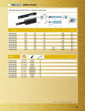 SERIES S-SCLCR/L SCREW-CLAMP BORING BAR ACCEPTS POSITIVE 7° CLEARANCE 80° RHOMBIC INSERTS Ødg7 95°Fig. 1 Dmin H F L 95° Fig. 2 F L1 L Designation D Dmin L L1 F Shape S04F-SCLCL03-D05 0.157 0.197 3.15 - 0.098 Fig. 1 S04F-SCLCR03-D05 0.157 0.197 3.15 - 0.098 Fig. 1 S05G-SCLCL03-D06 0.197 0.236 3.54 - 0.118 Fig. 1 S05G-SCLCR03-D06 0.197 0.236 3.54 - 0.118 Fig. 1 S06H-SCLCL04-D07 0.236 0.276 3.94 - 0.138 Fig. 1 S06H-SCLCR04-D07 0.236 0.276 3.94 - 0.138 Fig. 1 S07J-SCLCL04-D08 0.276 0.315 4.33 - 0.157 Fig. 1 S07J-SCLCR04-D08 0.276 0.315 4.33 - 0.157 Fig. 1 S10H-SCLCL03-D05 0.394 0.197 3.94 0.591 0.098 Fig. 2 S10H-SCLCR03-D05 0.394 0.197 3.94 0.591 0.098 Fig. 2 HARDWARE Insert Reference Insert Screw Insert Screw Wrench S04F-SCLCL03-D05 CC_T 1.10.9_ TS16031I T6 S04F-SCLCR03-D05 CC_T 1.10.9_ TS16031I T6 S05G-SCLCL03-D06 CC_T 1.10.9_ TS16031I T6 S05G-SCLCR03-D06 CC_T 1.10.9_ TS16031I T6 S06H-SCLCL04-D07 CC_T 1.41.1_ TS20038I/HG-P T6P S06H-SCLCR04-D07 CC_T 1.41.1_ TS20038I/HG-P T6P S07J-SCLCL04-D08 CC_T 1.41.1_ TS20038I/HG-P T6P S07J-SCLCR04-D08 CC_T 1.41.1_ TS20038I/HG-P T6P S10H-SCLCL03-D05 CC_T 1.10.9_ TS16031I T6 S10H-SCLCR03-D05 CC_T 1.10.9_ TS16031I T6 =P =M =K =N =S =H 235