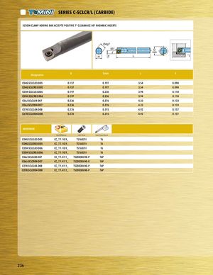 PART SERIES SERIES C-SCLCR/L (CARBIDE) PSCARETWSE-CRLIEASMP BORING BAR ACCEPTS POSITIVE 7° CLEARANCE 80° RHOMBIC INSERTS Ødg7 95° mDin H F L Designation D Dmin L F C04G-SCLCL03-D05 0.157 0.197 3.54 0.098 PCla0c4eGh-SoClLdCeRr03-D05 0.157 0.197 3.54 0.098 C05H-SCLCL03-D06 0.197 0.236 3.94 0.118 C05H-SCLCR03-D06 0.197 0.236 3.94 0.118 C06J-SCLCL04-D07 0.236 0.276 4.33 0.133 C06J-SCLCR04-D07 0.236 0.276 4.33 0.133 C07K-SCLCL04-D08 0.276 0.315 4.92 0.157 C07K-SCLCR04-D08 0.276 0.315 4.92 0.157 HARDWARE Insert Reference Insert Screw Insert Screw Wrench C04G-SCLCL03-D05 CC_T 1.10.9_ TS16031I T6 C04G-SCLCR03-D05 CC_T 1.10.9_ TS16031I T6 C05H-SCLCL03-D06 CC_T 1.10.9_ TS16031I T6 C05H-SCLCR03-D06 CC_T 1.10.9_ TS16031I T6 C06J-SCLCL04-D07 CC_T 1.41.1_ TS20038I/HG-P T6P C06J-SCLCR04-D07 CC_T 1.41.1_ TS20038I/HG-P T6P C07K-SCLCL04-D08 CC_T 1.41.1_ TS20038I/HG-P T6P C07K-SCLCR04-D08 CC_T 1.41.1_ TS20038I/HG-P T6P 236