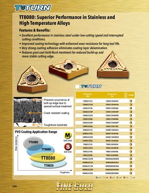 Wear resistance Grades TT8080: Superior Performance in Stainless and High Temperature Alloys Features & Benefits: • Excellent performance in stainless steel under low cutting speed and interrupted cutting conditions. • Improved coating technology with enhanced wear resistance for long tool life. • Very strong coating adhesion eliminates coating layer delamination. • Features post-coat Gold-Rush treatment for reduced build-up and more stable cutting edge. DesignationANSI DesignationISO TT8080 Prevents occurrence of CNMG431EA CNMG120404EA built-up-edge due to CNMG431EM CNMG120404EM special surface treatment CNMG431ML CNMG120404ML Crack resistant coating CNMG431MP CNMG120404MP CNMG432EM CNMG120408EM CNMG432ML CNMG120408ML CNMG432MP CNMG120408MP Toughened substrate CNMG433ML CNMG120412ML PVD Coating Application Range DNMG431EA DNMG150404EADNMG431MLDNMG150404ML DNMG432EM DNMG150408EM TT5080 M30-M50 DNMG432ML DNMG150408ML TNMG331EA TNMG160404EA TT9080 TNMG332EM TNMG160408EM S30-S50 TNMG331ML TNMG160404ML TNMG332ML TNMG160408ML TT8080 WNMG332EM WNMG060408EM WNMG431EA WNMG080404EA TT8020 WNMG431EM WNMG080404EM WNMG432EM WNMG080408EM Toughness WNMG432ML WNMG080408ML =P =M =K =N =S =H 244