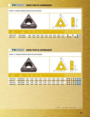 GradesGrades CT3000CT3000 PV3010PV3010 TT5080 TT5080 TT5100 TT5100TT8020 TT8125TT8115 TT9080TT8125 PART SERIES SERIES TCMT FA CHIPBREAKER PAORSTITSIVEREI7E°S CLEARANCE TRIANGULAR INSERTS FOR SUPER FINISHING 60° L D1 7° R D T ANSINumber asdf ISONumber feed feed ap ap L D T R D1minmaxminmax TCMT21.50.5FA TCMT110202FA 0.001 0.006 0.004 0.059 0.433 0.250 0.094 0.008 0.110 PTlaCcMeTh2o1.l5d1eFrA TCMT110204FA 0.002 0.006 0.004 0.059 0.394 0.250 0.094 0.016 0.110 SERIES TPMT FA CHIPBREAKER POSITIVE 11° CLEARANCE TRIANGULAR INSERTS FOR SUPER FINISHING 60° PART SERIES PART SERIES L D1 11° R D T ANSI ISO feed feed ap ap L D T R D1 Number Number min max min max TPMT730.5FA TPMT090202FA 0.001 0.006 0.004 0.047 0.376 0.219 0.094 0.008 0.098 TPMT731FA TPMT090204FA 0.002 0.008 0.008 0.047 0.339 0.219 0.094 0.016 0.098 TPMT32.51FA TPMT16T304FA 0.002 0.008 0.008 0.079 0.610 0.375 0.156 0.016 0.173 TPMT32.52FA asdTPf MT16T308FA 0.003 0.010 0.012 0.079 0.571 0.375 0.156 0.031 0.173 Placeholder =P =M =K =N =S =H 247