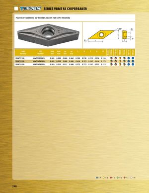 Grades CT3000 PV3010 TT5080 TT5100 TT8115 TT8125 PART SERIES SERIES VBMT FA CHIPBREAKER PAORSTITSIVEREI5E°S CLEARANCE 35° RHOMBIC INSERTS FOR SUPER FINISHING 35° D1 D 5° R L T ANSINumber asdf ISONumber feed feed ap ap L D T R D1minmaxminmax VBMT221FA VBMT110304FA 0.002 0.008 0.008 0.060 0.390 0.250 0.125 0.016 0.110 PVlaBcMeTh3o3l1dFeAr VBMT160404FA 0.002 0.008 0.008 0.080 0.614 0.375 0.187 0.016 0.173 VBMT332FA VBMT160408FA 0.003 0.010 0.012 0.080 0.575 0.375 0.187 0.031 0.173 PART SERIES PART SERIES asdf Placeholder =P =M =K =N =S =H 248