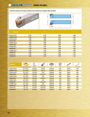 PART SERIES SERIES HCLNR/L PHAOROTKS-ELERVIEESR-HOLDER FOR EXTERNAL TURNING ACCEPTS NEGATIVE 80° RHOMBIC CNMX HB INSERTS H H F B 95° L Designation H B L F HCLNL12-43.5B 0.750 0.750 4.500 1.000 PHlaCcLeNhRo1l2d-4e3r.5B 0.750 0.750 4.500 1.000 HCLNL16-43.5D 1.000 1.000 6.000 1.250 HCLNL16-55D 1.000 1.000 6.000 1.250 HCLNR16-43.5D 1.000 1.000 6.000 1.250 HCLNR16-55D 1.000 1.000 6.000 1.250 HCLNL20-43.5E 1.250 1.250 7.000 1.500 HCLNL20-55E 1.250 1.250 7.000 1.500 HCLNR20-43.5E 1.250 1.250 7.000 1.500 HCLNR20-55E 1.250 1.250 7.000 1.500 HCLNL24-55E 1.500 1.500 7.000 1.750 HCLNR24-55E 1.500 1.500 7.000 1.750 HARDWARE Turning Holder Insert Reference Lever Lever Screw Seat Seat Pin Seat Pin Punch Lever Screw Wrench HCLNL12-43.5B CN_ X 43.5_ LCL12-NX LCS5-L21 LSC43-NX LSP4 SPP3-4 L-W3 HCLNR12-43.5B CN_ X 43.5_ LCL12-NX LCS5-L21 LSC43-NX LSP4 SPP3-4 L-W3 HCLNL16-43.5D CN_ X 43.5_ LCL12-NX LCS5 LSC43-NX LSP4 SPP3-4 L-W3 HCLNL16-55D CN_ X 55_ LCL16-NX LCS5-L25.5 LSC54-NX LSP5 SPP5-6 L-W3 HCLNR16-43.5D CN_ X 43.5_ LCL12-NX LCS5 LSC43-NX LSP4 SPP3-4 L-W3 HCLNR16-55D CN_ X 55_ LCL16-NX LCS5-L25.5 LSC54-NX LSP5 SPP5-6 L-W3 HCLNL20-43.5E CN_ X 43.5_ LCL12-NX LCS5 LSC43-NX LSP4 SPP3-4 L-W3 HCLNL20-55E CN_ X 55_ LCL16-NX LCS5-L25.5 LSC54-NX LSP5 SPP5-6 L-W3 HCLNR20-43.5E CN_ X 43.5_ LCL12-NX LCS5 LSC43-NX LSP4 SPP3-4 L-W3 HCLNR20-55E CN_ X 55_ LCL16-NX LCS5-L25.5 LSC54-NX LSP5 SPP5-6 L-W3 HCLNL24-55E CN_ X 55_ LCL16-NX LCS5-L25.5 LSC54-NX LSP5 SPP5-6 L-W3 HCLNR24-55E CN_ X 55_ LCL16-NX LCS5-L25.5 LSC54-NX LSP5 SPP5-6 L-W3 HARDWARE hardware desc 1 hardware desc 2 hardware desc 3 hardware desc 4 hardware desc 5 hardware desc 6 hardware desc 7 254