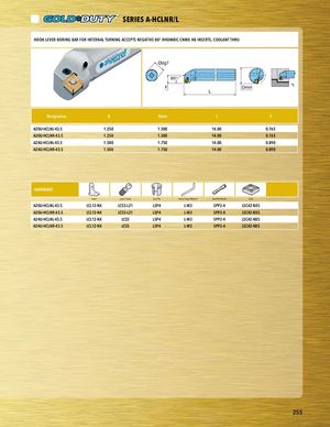 PART SERIES SERIES A-HCLNR/L PHAOROTKS-ELERVIEESR-BORING BAR FOR INTERNAL TURNING ACCEPTS NEGATIVE 80° RHOMBIC CNMX HB INSERTS, COOLANT THRU Ødg7 95° F Dmin L Designation D Dmin L F A20U-HCLNL-43.5 1.250 1.500 14.00 0.765 PAla2c0eUh-HoCldLNeRr-43.5 1.250 1.500 14.00 0.765 A24U-HCLNL-43.5 1.500 1.750 14.00 0.890 A24U-HCLNR-43.5 1.500 1.750 14.00 0.890 HARDWARE Lever Lever Screw Seat Pin Lever Screw Wrench Seat Pin Punch Seat A20U-HCLNL-43.5 LCL12-NX LCS5-L21 LSP4 L-W3 SPP3-4 LSC42-NXS A20U-HCLNR-43.5 LCL12-NX LCS5-L21 LSP4 L-W3 SPP3-4 LSC42-NXS A24U-HCLNL-43.5 LCL12-NX LCS5 LSP4 L-W3 SPP3-4 LSC42-NXS A24U-HCLNR-43.5 LCL12-NX LCS5 LSP4 L-W3 SPP3-4 LSC42-NXS HARDWARE hardware desc 1 hardware desc 2 hardware desc 3 hardware desc 4 hardware desc 5 hardware desc 6 hardware desc 7 255