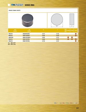 Grades PART SERIES SERIES RNG PRAORUTNSDERCIEERSAMIC INSERTS D T NuAmNSbIaesrdf ISONumber D T TC3020 TC3030 TC430 RNG32T6 RNGN090300T6 0.375 0.125 PRlaNcGe4h3oT6lder RNGN120400T6 0.500 0.187 RNG45E04 RNGN120700E04 0.500 0.313 RNG45T6 RNGN120700T6 0.500 0.313 RNG65T6 RNGN190700T6 0.750 0.312 T6 = .004" @ 20° E04 = .002" hone =P =M =K =N =S =H 257