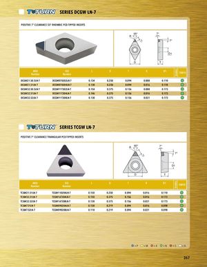 GradesGrades PART SERIES SERIES DCGW LN-7 PAORSTITSIVEREI7E°S CLEARANCE 55° RHOMBIC PCD-TIPPED INSERTS 55° 7° R L 7° D1 D T NuAmNSbIearsdf ISONumber L D T R D1 TD810 DCGW21.50.5LN-7 DCGW070202LN-7 0.134 0.250 0.094 0.008 0.110 PDlaCcGeWh2o1ld.5e1rLN-7 DCGW070204LN-7 0.130 0.250 0.094 0.016 0.110 DCGW32.50.5LN-7 DCGW11T302LN-7 0.154 0.375 0.156 0.008 0.173 DCGW32.51LN-7 DCGW11T304LN-7 0.146 0.375 0.156 0.016 0.173 DCGW32.52LN-7 DCGW11T308LN-7 0.130 0.375 0.156 0.031 0.173 SERIES TCGW LN-7 POSITPIVAE 7R° TCLESAREARNCIEETSRIANGULAR PCD-TIPPED INSERTS PART SERIES R 60° 7° L 7° D1 D T ANSINumber ISONumber L D T R D1 TD810 TCGW21.51LN-7 asdf TCGW110204LN-7 0.150 0.250 0.094 0.016 0.110 TCGW32.51LN-7 TCGW16T304LN-7 0.150 0.375 0.156 0.016 0.173 TCGW32.52LN-7 TCGW16T308LN-7 0.138 0.375 0.156 0.031 0.173 PTlaCGceWh7o3l1dLeNr-7 TCGW090204LN-7 0.130 0.219 0.094 0.016 0.098 TCGW732LN-7 TCGW090208LN-7 0.118 0.219 0.094 0.031 0.098 =P =M =K =N =S =H 267
