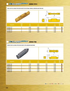 GradesGrades PART SERIES SERIES TST-E SPIANRGTLSEE-ERNIEDSFULL-RADIUS PRECISION INSERTS FOR EXTERNAL TURNING, GROOVING AND PROFILING R W B 7° L H InsertDesignatiaosndfSeatSizeW(inch) R(inch) L(inch) H(inch) TT9080 TST2.39E-1.19 2 0.094 0.047 0.79 0.185 PTlSaTc3e.0h0oEl-d1e.5r0 3 0.118 0.059 0.79 0.185 TST3.18E-1.59 3 0.125 0.062 0.79 0.185 TST4.78E-2.39 5 0.188 0.094 0.98 0.205 SERIES TDA DOUBLE-END FULL-RADIUS PRECISION INSERTS FOR ALUMINUM MACHINING R W B H 7° L Designation InsertSeatSize W(inch) R(inch) L(inch) H(inch) K10 TDA3.00-1.50 3 0.118 0.059 0.79 0.185 TDA4.00-2.00 4 0.157 0.079 0.79 0.185 TDA4.78-2.39 5 0.188 0.094 0.98 0.205 TDA5.00-2.50 5 0.197 0.098 0.98 0.205 TDA6.00-3.00 6 0.236 0.118 0.98 0.205 TDA8.00-4.00 8 0.315 0.157 1.18 0.252 =P =M =K =N =S =H 270