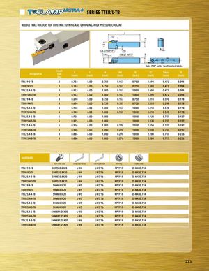 PART SERIES SERIES TTER/L-TB PMAIRDTDSLERTIMESAX HOLDERS FOR EXTERNAL TURNING AND GROOVING, HIGH PRESSURE COOLANT L1 L2 H H 1/8-27 NPTF H4 A Tmax 1/8-27 NPTF B f Note: .750" holder has 3 coolant inlets. Designation InsertSeatSize F(inch) L(inch) H(inch) H4(inch) B(inch) L2(inch) Tmax(inch) A(inch) TTEL19-3-TB 3 0.703 5.00 0.750 0.157 0.750 1.690 0.472 0.094 PTlaTEcRe1h9o-3ld-TeBr 3 0.703 5.00 0.750 0.157 0.750 1.690 0.472 0.094 TTEL25.4-3-TB 3 0.953 6.00 1.000 0.157 1.000 1.690 0.472 0.094 TTER25.4-3-TB 3 0.953 6.00 1.000 0.157 1.000 1.690 0.472 0.094 TTEL19-4-TB 4 0.690 5.00 0.750 0.157 0.750 1.810 0.590 0.118 TTER19-4-TB 4 0.690 5.00 0.750 0.157 0.750 1.810 0.590 0.118 TTEL25.4-4-TB 4 0.940 6.00 1.000 0.157 1.000 1.810 0.590 0.118 TTER25.4-4-TB 4 0.940 6.00 1.000 0.157 1.000 1.810 0.590 0.118 TTEL25.4-5-TB 5 0.925 6.00 1.000 - 1.000 1.930 0.787 0.157 TTER25.4-5-TB 5 0.925 6.00 1.000 - 1.000 1.930 0.787 0.157 TTEL25.4-6-TB 6 0.906 6.00 1.000 0.276 1.000 2.050 0.787 0.197 TTER25.4-6-TB 6 0.906 6.00 1.000 0.276 1.000 2.050 0.787 0.197 TTEL25.4-8-TB 8 0.886 6.00 1.000 0.276 1.000 2.280 0.787 0.236 TTER25.4-8-TB 8 0.886 6.00 1.000 0.276 1.000 2.280 0.787 0.236 HARDWARE Insert Clamp Screw Clamp Screw Wrench Inlet Plug Wrench Inlet Plug Sealing Screw TTEL19-3-TB SHM5X0.8X20 L-W4 L-W3/16 NPTF1/8 SS-M4X0.7X4 TTER19-3-TB SHM5X0.8X20 L-W4 L-W3/16 NPTF1/8 SS-M4X0.7X4 TTEL25.4-3-TB SHM5X0.8X20 L-W4 L-W3/16 NPTF1/8 SS-M4X0.7X4 TTER25.4-3-TB SHM5X0.8X20 L-W4 L-W3/16 NPTF1/8 SS-M4X0.7X4 TTEL19-4-TB SHM6X1X20 L-W5 L-W3/16 NPTF1/8 SS-M4X0.7X4 TTER19-4-TB SHM6X1X20 L-W5 L-W3/16 NPTF1/8 SS-M4X0.7X4 TTEL25.4-4-TB SHM6X1X20 L-W5 L-W3/16 NPTF1/8 SS-M4X0.7X4 TTER25.4-4-TB SHM6X1X20 L-W5 L-W3/16 NPTF1/8 SS-M4X0.7X4 TTEL25.4-5-TB SHM6X1X20 L-W5 L-W3/16 NPTF1/8 SS-M4X0.7X4 TTER25.4-5-TB SHM6X1X20 L-W5 L-W3/16 NPTF1/8 SS-M4X0.7X4 TTEL25.4-6-TB SHM8X1.25X20 L-W6 L-W3/16 NPTF1/8 SS-M4X0.7X4 TTER25.4-6-TB SHM8X1.25X20 L-W6 L-W3/16 NPTF1/8 SS-M4X0.7X4 TTEL25.4-8-TB SHM8X1.25X20 L-W6 L-W3/16 NPTF1/8 SS-M4X0.7X4 TTER25.4-8-TB SHM8X1.25X20 L-W6 L-W3/16 NPTF1/8 SS-M4X0.7X4 HARDWARE hardware desc 1 hardware desc 2 hardware desc 3 hardware desc 4 hardware desc 5 hardware desc 6 hardware desc 7 273