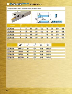 PART SERIES SERIES TTER/L-TB PLOANRTGSTEMRAIEXSHOLDERS FOR EXTERNAL TURNING AND GROOVING, HIGH PRESSURE COOLANT L1 L2 H H 1/8-27 NPTF H4 A Tmax 1/8-27 NPTF B f Designation InsertSeatSize F(inch) L(inch) H(inch) H4(inch) B(inch) L2(inch) Tmax(inch) A(inch) TTEL25.4-3T25-TB 3 0.953 6.00 1.000 0.157 1.000 2.000 0.980 0.094 PTlaTEcRe2h5o.4ld-3eTr25-TB 3 0.953 6.00 1.000 0.157 1.000 2.000 0.980 0.094 TTEL25.4-4T25-TB 4 0.940 6.00 1.000 0.157 1.000 2.165 0.980 0.118 TTER25.4-4T25-TB 4 0.940 6.00 1.000 0.157 1.000 2.165 0.980 0.118 TTEL25.4-5T32-TB 5 0.925 6.00 1.000 - 1.000 2.322 1.260 0.156 TTER25.4-5T32-TB 5 0.925 6.00 1.000 - 1.000 2.322 1.260 0.156 TTEL25.4-6T32-TB 6 0.906 6.00 1.000 0.276 1.000 2.441 1.260 0.197 TTER25.4-6T32-TB 6 0.906 6.00 1.000 0.276 1.000 2.441 1.260 0.197 HARDWARE Insert Clamp Screw Clamp Screw Wrench Inlet Plug Wrench Inlet Plug Sealing Screw TTEL25.4-3T25-TB SHM5X0.8X20 L-W4 L-W3/16 NPTF1/8 SS-M4X0.7X4 TTER25.4-3T25-TB SHM5X0.8X20 L-W4 L-W3/16 NPTF1/8 SS-M4X0.7X4 TTEL25.4-4T25-TB SHM6X1X20 L-W5 L-W3/16 NPTF1/8 SS-M4X0.7X4 TTER25.4-4T25-TB SHM6X1X20 L-W5 L-W3/16 NPTF1/8 SS-M4X0.7X4 TTEL25.4-5T32-TB SHM6X1X20 L-W5 L-W3/16 NPTF1/8 SS-M4X0.7X4 TTER25.4-5T32-TB SHM6X1X20 L-W5 L-W3/16 NPTF1/8 SS-M4X0.7X4 TTEL25.4-6T32-TB SHM8X1.25X20 L-W6 L-W3/16 NPTF1/8 SS-M4X0.7X4 TTER25.4-6T32-TB SHM8X1.25X20 L-W6 L-W3/16 NPTF1/8 SS-M4X0.7X4 274