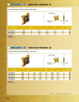 GradesGrades PART SERIES SERIES TQS27 THREADING - 55° PFOARUTRSCEORRIENSER INSERT FOR PRECISION THREADING - PARTIAL PROFILE Ø 1.063” (27mm) P Repeatability R±.001” ±.001” L A° Designatiaosndf R A P(Deg) L TPIMin TPIMax TT9080 TQS27-4WT-0.05 0.002 55 0.157 0.114 6.4 / D 54 PTlaQcSe2h7-o5lWdTe-0r .15 0.006 55 0.197 0.130 6.4 / D 19 TQS27-6WT-0.25 0.010 55 0.236 0.154 6.4 / D 12 D: Diameter TPI: Threads / Inch SERIES TQS27 THREADING - 60° FOURPCAORRNETR ISNESERRTIFEORSPRECISION THREADING - PARTIAL PROFILE PART SERIES Ø 1.063” (27mm) P Repeatability R±.001” ±.001” L A° Designation R A P(Deg) L Pitch PitchMinMax TPIMin TPIMax TT9080 TQS27-4MT-0.05 0.002 60 0.157 0.110 0.45 .175xD 5.7 / D 56 TQS27-4MT-0.14 asdf 0.005 60 0.157 0.106 1.11 .175xD 5.7 / D 23 TQS27-5MT-0.15 0.006 60 0.197 0.122 1.25 .175xD 5.7 / D 20 TQS27-5MT-0.20 0.008 60 0.197 0.122 1.63 .175xD 5.7 / D 16 PTlaQcSe2h7-o6lMdTe-0r .25 0.010 60 0.236 0.142 1.94 .175xD 5.7 / D 13 D: Diameter TPI: Threads / Inch =P =M =K =N =S =H 282